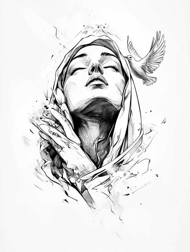 Mary, the Mother of Jesus, is rendered here as a serene veiled figure whose portrait embodies grace, compassion, and spiritual resilience. Executed in a refined black and grey palette, the design relies on delicate, continuous line work to convey soft facial features, folds of fabric, and the gentle fall of the veil. The central bust sits in a quiet vertical composition, with a subtle halo rising above the head and feather accents at the temple and shoulder area that evoke themes of purity, protection, and the dove-like symbolism of peace. The choice of fine-line tattoo technique emphasizes restraint and elegance, inviting a closer look at the micro-shading and subtle cross-hatching that build volume without overpowering the silhouette. The lines vary in weight to distinguish highlights and shadows, while negative space around the face and veil adds airiness and breath to the image, echoing traditional religious iconography in a contemporary ink form. Symbolically, Mary is often interpreted as motherhood, mercy, and intercession; the halo marks sanctity and divine connection, while the veil suggests modesty, humility, and the hidden strength of maternal love. The feather elements introduce a sense of ascension and spiritual guidance, reinforcing the idea of protection over the wearer. This tattoo design sits comfortably within the realms of modern black and grey ink, yet it nods to classical portraiture and sacred art, making it suitable for those seeking meaningful tattoos that blend reverence with contemporary aesthetics. For readers exploring custom tattoo design, this Mary-inspired piece offers a refined balance between line precision and respectful symbolism, making it a meaningful choice for upper-arm, shoulder, or chest placements. Note that AI-generated concept art informs the initial composition, and a tattoo artist would adapt proportions to suit the wearer’s anatomy while preserving the intended mood and symbolism. The image functions as a compact tribute to motherhood and divine guardianship, inviting introspection and a quiet, dignified presence in skin, and it also serves as an example of how meaningful tattoos can be executed in a minimalist but expressive line-work language suitable for both newcomers and seasoned collectors alike.
