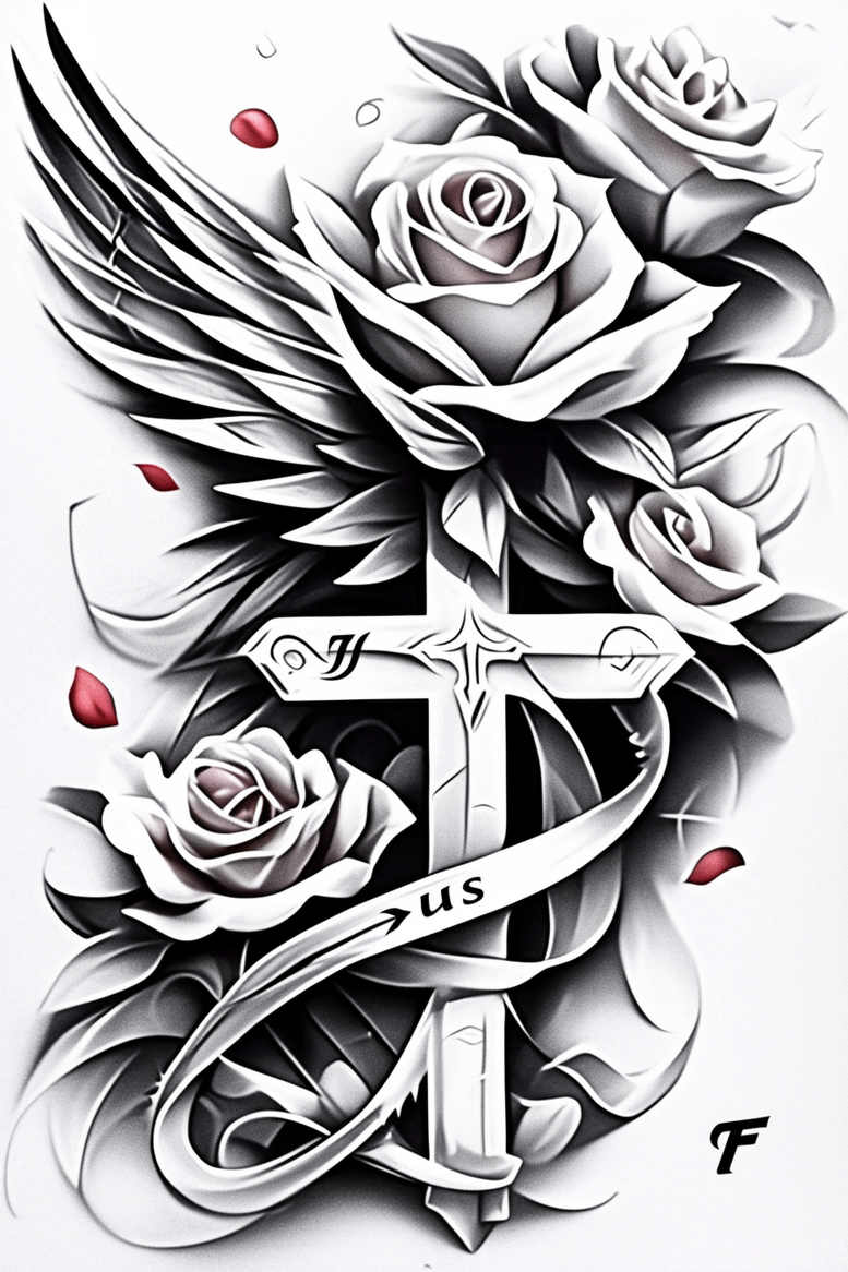 AI-generated tattoo project concept presenting a dramatic black and grey composition centered on a Christian cross, roses, and winged flourishes. The design uses soft gradient shading and crisp linework to create depth, with the cross forming a strong vertical anchor that is wrapped by stylized roses and flowing ribbons. A winged element sweeps behind the cross, adding motion and a sense of ascent, while scattered petals introduce light contrast against the dense black ink areas. The banner-like curve threading through the composition carries script-like accents, hinting at a personal message. The piece embraces a realism-inspired approach, but it remains clearly a tattoo design suitable for cover-up concepts if the client seeks to mask existing work. This AI-generated concept emphasizes bold negative space and intricate shading to accommodate large or small placements across the chest, back, sleeve, or shoulder. The imagery resonates with symbolism: the cross for faith and endurance, the roses for love and memory, and the wings for freedom and transcendence, all bound together in a single cohesive body art piece. From an execution standpoint, the design relies on black and grey values to define form, with gradual tonal transitions that mimic natural skin tone and depth, including fine line cues, feather-like detailing, and petals with gentle bevels. The composition can be adapted to various sizes, maintaining legibility of the ribbon script and the petal clusters at smaller scales, while preserving the dramatic contrast that makes it readable from a distance. For tattoo enthusiasts, this concept aligns with traditional and contemporary aesthetics, offering a custom tattoo design that blends religious iconography with modern shading techniques, suitable for chest, back, or forearm canvases. It also serves as a meaningful tattoo choice for those seeking symbolism-rich ink, an homage to faith, memory, and resilience, and as a strong example of black and grey realism in a rose and cross motif. Given its depth and darkness, it naturally supports cover-up workflows, enabling experienced artists to obscure prior tattoos with confidence, and reinforcing its status as a robust cover-up option.