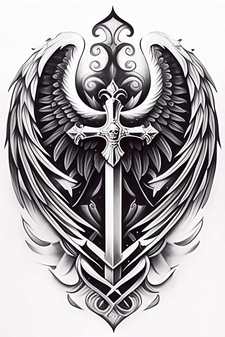 AI-generated tattoo project concept presenting a central sword pierced by a pair of sweeping wings, rendered in black and grey with bold shadows and refined linework. The blade stands vertical, its edge clean and metallic, while the cross-guard features a skull motif framed by ornate scrolls that echo the curling tips of the wings. Layered feathers cascade along the wings, creating depth as the design narrows toward a pointed base. The composition relies on high-contrast shading to achieve a realistic metallic gleam and a soft feather texture, making this a striking tattoo design for a large area such as the back, chest, or upper arm. The symbolism blends protection, strength, and freedom—the sword as authority, the wings as ascent, the skull as mortality—allowing personal meaning to be layered through placement, scale, and line density. It is especially suited for cover-up applications where existing darker ink can be incorporated into the black regions while preserving the silhouette. As an AI-generated tattoo project concept, it demonstrates how digital ideation can yield cohesive, scalable designs with clear readability in black and grey, suitable for both realism-inspired shading and graphic, ornamental touches. The design fuses classical emblem motifs with modern tattoo storytelling and can be adapted with variations such as different wing styles or a softer gradient to suit individual preferences. The piece is a versatile template for forearms, shoulders, or upper backs while maintaining legibility at smaller sizes. Keywords for visibility include tattoo, tattoo design, meaningful tattoos, fine line tattoo, lotus flower tattoo, infinity tattoo, tribal tattoo, rose tattoo design, small tattoos, flower tattoos, custom tattoo design, Japanese style tattoo, black and grey, realistic tattoo, body art, ink.