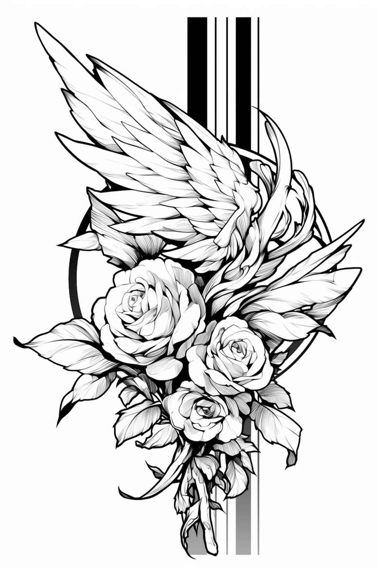 AI-generated tattoo project presenting a winged bouquet of roses in crisp black and grey linework, framed by geometric bars and a circular motif; the repeating geometric pattern behind the florals provides a modern counterpoint to the natural forms. The composition centers a pair of expansive wings curving upward, with a cluster of three roses at the base and accented by leaves and twisting stems. Fine-line detailing and precise black outlines create a readable, durable image that translates well to skin, while subtle shading through hatching adds depth without overpowering the linear quality. The geometric elements behind the florals—vertical bars and a circular ring—provide a modern counterpoint to the natural forms, producing a balanced design that reads clearly from distance and holds up over time. The overall mood blends elegance, motion, and resilience, making it a versatile tattoo design for placement on the back, shoulder blade, or forearm, and scalable for smaller or larger canvases. The wings symbolize aspiration and protection, the roses convey beauty and renewal, and the leaves tie the composition together with a sense of growth. The black-and-grey palette ensures timeless appeal, while the clean lines support long-term legibility. This piece leans toward fine-line tattoo technique, with careful line weight variation to preserve detail in both large and small formats. As an AI-generated tattoo project, it demonstrates how modern algorithms can propose sophisticated floral-and-wing symbology that can be refined by a tattoo professional into bespoke body art. For keywords, this design aligns with tattoo, tattoo design, meaningful tattoos, fine line tattoo, rose tattoo design, small tattoos, flower tattoos, custom tattoo design, Japanese style tattoo, black and grey, realistic tattoo, body art, ink.