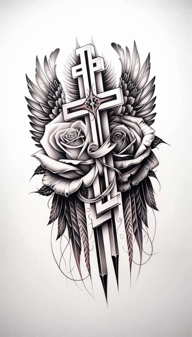 This AI-generated tattoo project presents a dramatic black and grey composition centered on a stylized cross, framed by expansive wings and two lifelike roses. The cross is built from bold geometric bars with clean edges, while the wings unfurl in a dense array of feathers that provide vertical momentum. The roses are rendered in smooth grayscale with delicate shading on each petal, giving a realistic texture against the solid contrast of the cross. Leaves cascade beneath the main motif, with curling filaments and sharp tips adding motion and edge to the design. Symbolically, the cross stands for faith and sacrifice, the wings suggest protection and ascent, and the roses evoke love, memory, and resilience. The interplay of strong blacks, midtones, and subtle gradients makes the tattoo design powerful from a distance and readable up close, ensuring longevity on the skin. The composition leverages negative space and crisp linework to emphasize the central cross while allowing surrounding floral elements to breathe. This piece is well-suited for placement on the back, chest, or upper arm, and its heavy dark shading makes it an excellent option for a cover-up on older tattoos or busy areas, where the solid geometry can mask underlying ink. As an AI-generated tattoo project, it showcases how modern ink artistry can combine meaningful symbolism with precise shading and graphic geometry. The aesthetic draws on black and grey realism, with a focus on high-contrast silhouettes, texture in the petals and leaves, and a cohesive harmony between hard lines and soft shading. Whether scaled up or adapted to a vertical sleeve or chest panel, this design preserves the focal cross while delivering a striking, timeless tattoo design that aligns with the needs of those seeking a bold statement or a thoughtful cover-up.