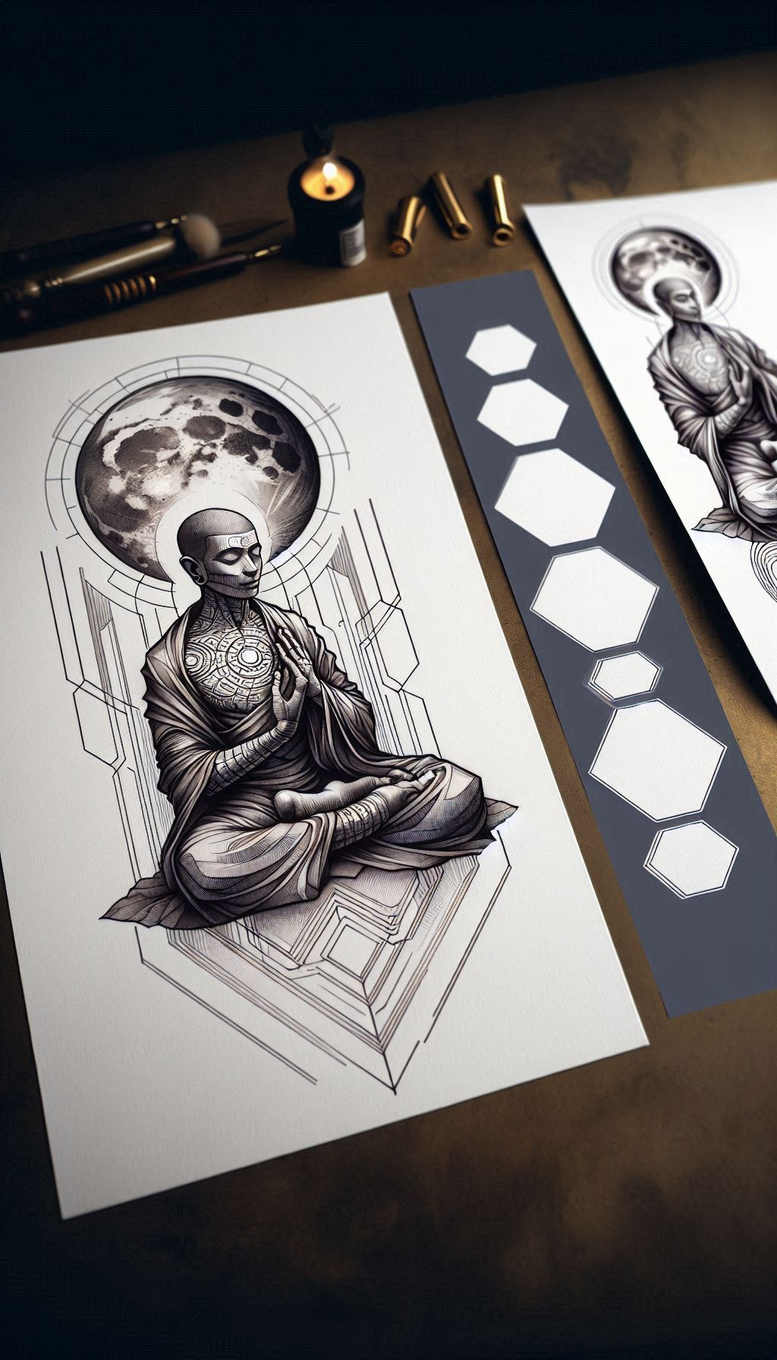 This AI-generated concept presents Guanyin, the Bodhisattva of Compassion, in a serene, meditative pose rendered in precise fine-line black-and-grey ink. The central figure conveys mercy and awakening, often depicted perched on a lotus, though here the emphasis is on graceful contours, delicate robes, and a subtle halo that radiates calm. The line work captures folds and shading with an economy of strokes, allowing the silhouette to feel both delicate and enduring. To the right, a repeating hexagon motif introduces a contemporary graphic counterpoint, evoking interconnection and balance and transforming sacred iconography into a modern body-art design. The composition juxtaposes the timeless symbolism of compassion with the clean geometry of hex tessellations, suggesting a dialogue between sacred and secular realms and making the piece versatile for small tattoos or larger, more detailed executions. The grayscale palette enhances depth and texture, with the fine lines building a sense of movement and nuance in the garment and halo while the hex field remains crisp and legible. Symbolically, Guanyin embodies mercy, kindness, and protection for all beings; in tattoo form, the image serves as a daily reminder to cultivate empathy, mindfulness, and resilience. This concept also nods to lotus symbolism, a traditional emblem of spiritual purity and rebirth, integrated through the tonal balance rather than explicit lotus petals. The design aims for broad appeal, blending classical iconography with contemporary geometry, and is suitable for a variety of placements and skin tones. While presented as an AI-generated concept, the underlying idea centers on meaningful tattoos, custom tattoo design, and the potential for a refined fine-line tattoo aesthetic that remains legible and elegant on the skin.