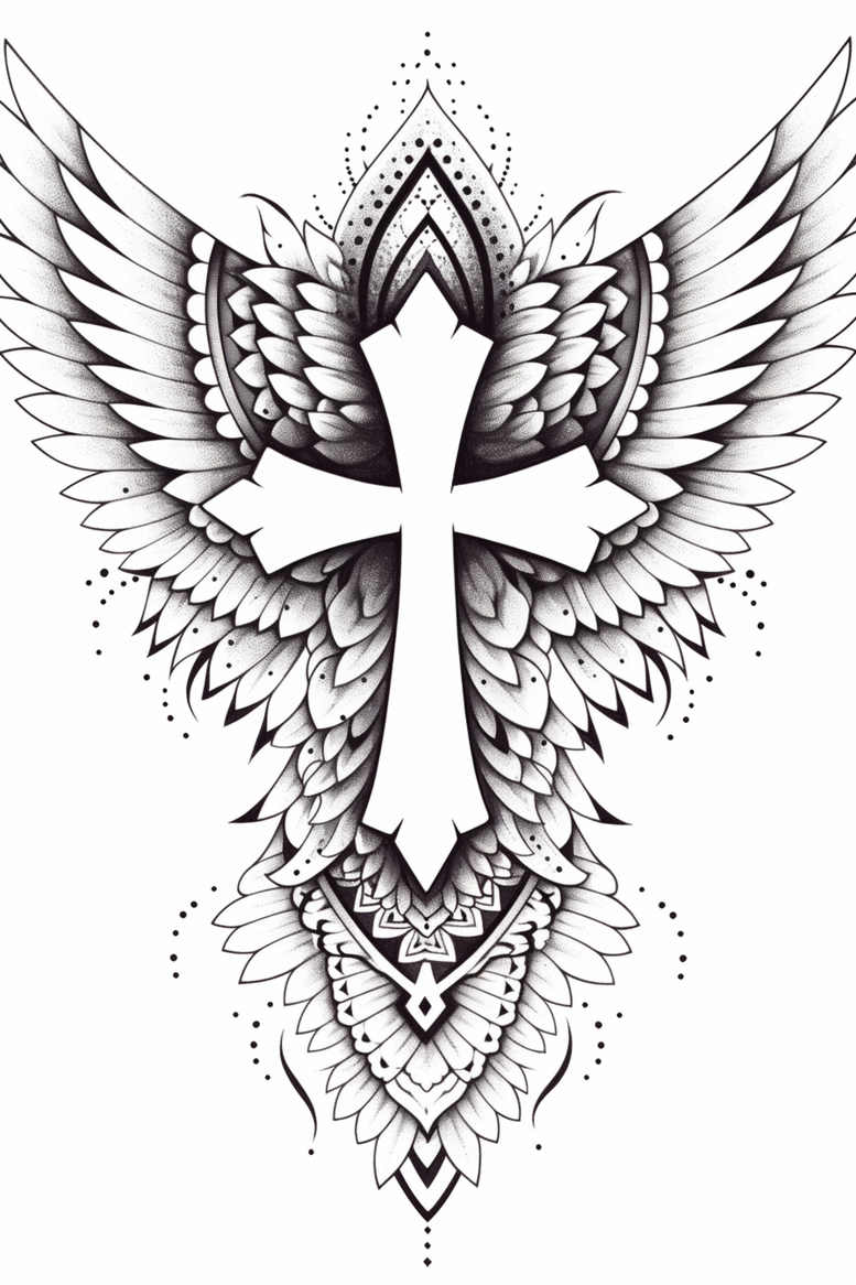 Designed as a striking black and grey concept, this tattoo centers on a bold cross flanked by expansive wings, with an intricately patterned mandala form cascading below. The composition blends clean negative space with dense shading to create a dynamic silhouette: the cross anchors the design, while the wings render a sense of ascent and protection through layered feather detail, and the lower mandala motif introduces geometric rhythm and symmetry. Executed in a refined fine line technique, the work features delicate stippling and gradual gradients to yield depth without color, making it versatile for various skin tones and placements. The motif resonates with themes of faith, freedom, and balance, with the wings hinting at spiritual ascent and the mandala suggesting meditation and harmony. As an AI-generated tattoo project, this concept prioritizes crisp line work and scalability for different body areas—from a bold chest piece to a forearm design. The black-and-grey palette supports strong contrast and precise texture, ideal for a refined, timeless look. The pattern-rich bottom section creates a dense focal point that is particularly suitable for cover-up scenarios, allowing surrounding feathered geometry to mask old ink while maintaining readability of the central cross. For clients seeking meaningful tattoos that fuse symbolism with adaptable artistry, this design offers a strong base for a custom tattoo design, easily adjustable in size and placement. Whether aiming for a dramatic back piece or a more compact shoulder tattoo, the layout preserves the cross’s legibility while the wings and mandala maintain visual interest through pattern-driven detail. In practical terms, the tattoo design champions a black-and-grey workflow, emphasizing contrast, shading, and texture; it supports cover-up success, and it aligns with trends in fine line, pattern-based, and classical iconography, while remaining adaptable to personal meanings and cultural contexts. AI generation ensures a fresh, contemporary approach to a timeless motif, making this a compelling option for meaningful tattoos, meaningful ink, and premium body art.