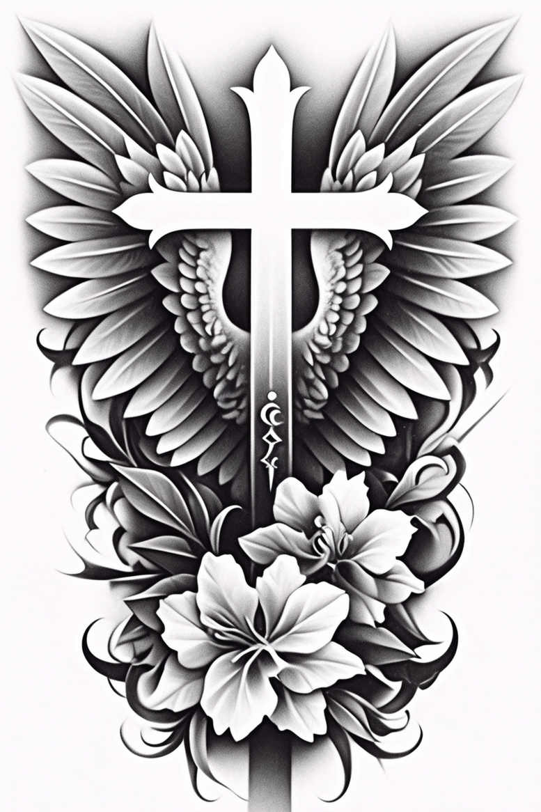AI-generated tattoo project rendered in black-and-grey, this design centers a cross pierced by a slender blade, wings, and hibiscus blooms. The vertical composition uses a bold cross as the anchor while feathered wings fan outward, creating dynamic negative space and movement. Crisp linework defines the cross and blade, while the wings and flowers are shaded with smooth grayscale gradients, producing a realistic sense of depth. The hibiscus blossoms at the base provide contrast through softer petal shading and bright highlights against dense dark shading, offering a vivid focal point. Symbolically, the cross conveys faith and protection; the wings imply ascent and freedom; the hibiscus adds beauty and resilience. Technically, the piece translates well at different scales, lending itself to placement on the forearm, calf, or back. For tattoo enthusiasts seeking a meaningful design with classic motifs reinterpreted in grayscale realism, this tattoo design delivers a strong silhouette and refined detail in black and grey ink. As an AI-generated tattoo project, it demonstrates how modern algorithms can craft versatile body art concepts that work as covetable cover-ups thanks to solid negative space and high-contrast regions. The piece nods to traditions such as Japanese style tattoo and traditional black-and-grey realism, while remaining adaptable to small tattoos or larger, more elaborate commissions. In short, this cross-with-wings-and-flowers concept offers a timeless symbol set—faith, freedom, and beauty—executed in a contemporary, high-contrast, fine line-friendly approach that translates to meaningful tattoos and custom tattoo design across body art, ink, and beyond.