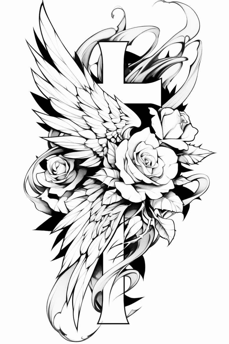 AI-generated concept presents a bold vertical composition that blends sacred symbolism with natural beauty. At the center sits a strong cross, partially veiled by sweeping wings that extend outward in fluid, feathered lines. The wings are rendered with crisp fine-line work and deliberate shading to create depth in every feather and contour. Intertwined with the wings are roses, their petals shaped with soft gradients and precise outlines to convey texture and delicacy. Leaves curl around the blossoms, guiding the eye and enhancing the flow across the skin. A dark negative space behind the main elements creates contrast, allowing the entire design to stand out while maintaining a cohesive black and grey palette. The motif carries meaning: the cross embodies faith and endurance; wings signify protection and ascent; roses symbolize love, renewal, and resilience. The overall composition emphasizes a vertical axis, making it suitable for the spine, chest, or thigh and adaptable to larger canvases. This tattoo concept sits firmly within fine-line and black and grey styles, balancing geometric balance with organic florals, and it suits meaningful tattoos as well as bold flower tattoos. Because of the dense dark silhouettes, the design is ideal for a cover-up, capable of concealing older ink while preserving sharp lines and smooth shading. Presented here as an AI-generated tattoo project concept, it demonstrates how modern AI can inspire custom tattoo design ideas that blend symbolism with contemporary technique. For tattoo enthusiasts seeking a dramatic, intricate tattoo design, this concept offers a timeless theme with potential refinements such as additional roses, alternate leaf shapes, or tweaks to wing span to fit specific placements. The artwork translates well into a striking, refined black and grey tattoo that honors sacred imagery while embracing floral elegance and the enduring language of body art.