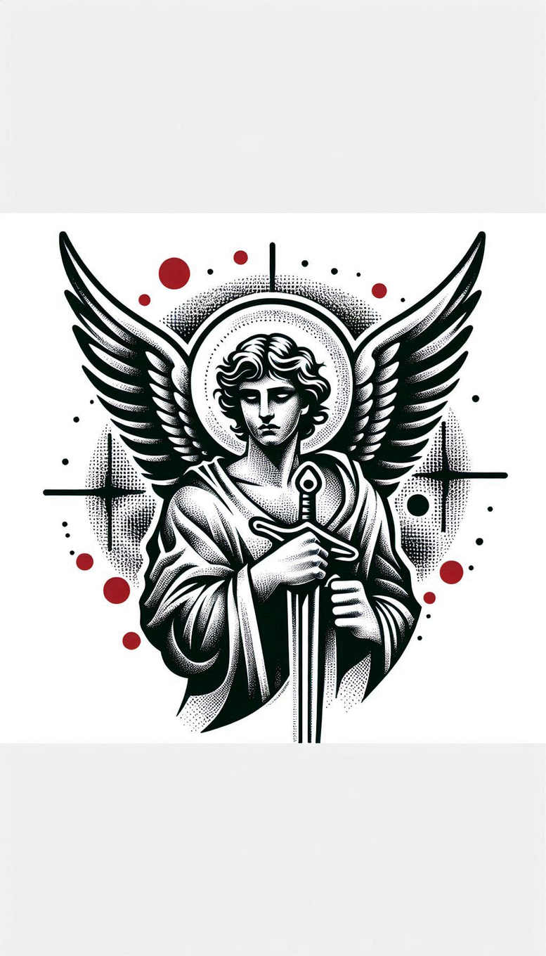An AI-generated tattoo project, this design portrays a solemn angel with outstretched wings, a circular halo, and a sword held upright. Rendered in stark black and grey, the composition relies on bold contour lines and dense stippling to create depth and texture on the skin. The wings sweep outward with meticulous feather detail, while the halo forms a circular ring that centers the angel’s serene face. The sword acts as a vertical anchor, gripped by both hands, symbolizing protection, guidance, and resolve. Surrounding geometric accents and scattered dot patterns give the piece a contemporary tattoo aesthetic, and the red circular embellishments provide a striking contrast that catches the eye. The graphic patterns—stippling gradients, halftone shading, and circular motifs—contribute rhythm and boldness, helping the design stand out. The generous negative space and high-contrast ink make this motif highly suitable for cover-up work, offering a cohesive black-and-grey block that can obscure older tattoos while still reading as a singular, integrated image. While rooted in traditional sacred imagery, the piece embraces modern linework, making it adaptable to large backpieces or compact forearm pieces through careful scaling. Symbolically, angels signify protection and illumination, while the sword conveys courage and authority; together they convey resilience and faith. The piece showcases precise line work and a balanced mix of solid fills and textured shading, resulting in a meaningful tattoo design with strong ink performance. As an AI-generated tattoo project, it demonstrates a creative synthesis of timeless iconography with contemporary shading techniques; the design invites customization for meaningful tattoos, custom tattoo design, or pattern-rich body art, while the keywords tattoo, tattoo design, black and grey, ink, meaningful tattoos, and fine line tattoo support discoverability.
