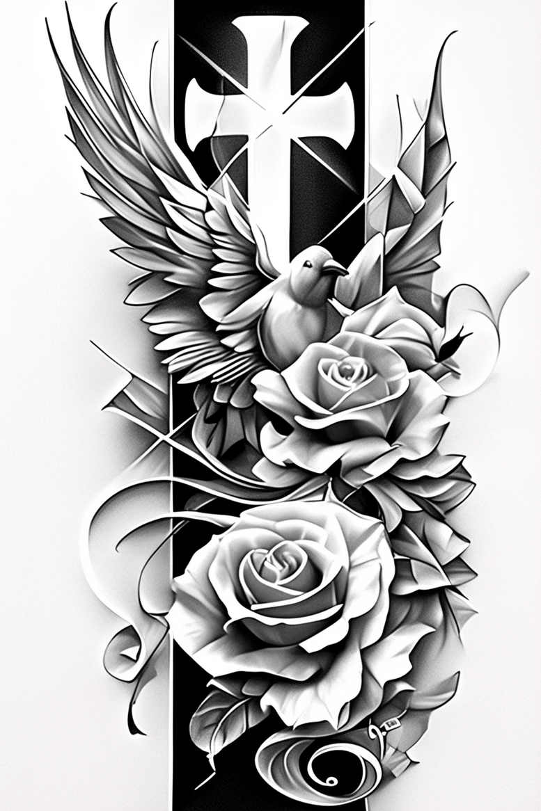 Presented as an AI-generated tattoo project, this black-and-grey composition centers on a vertical cross set against a stark panel, with a dove in mid-flight and two roses curling along the shaft. The design blends realism with graphic pattern elements: crisp edge lines for the cross, smooth gradient shading on the dove, and life-like petal work on the roses, while sweeping ribbons and geometric glints cut across the composition to create rhythm and depth. The cross acts as a backbone, symbolizing faith and endurance; the dove represents hope and peace; the roses convey love, memory, and resilience—meaningful tattoos that resonate with personal narratives. The high-contrast tonal range, precise fine shading, and careful layering give this tattoo design a sense of movement that would read strongly on larger canvases such as a back or chest, yet also converts gracefully into smaller pieces for a sleeve or forearm. Because of the dense grayscale values and bold negative space behind the cross, this concept is particularly well-suited as a cover-up, offering both concealment and a striking new focal point for existing marks. The presence of graphic patterns, geometric divisions, and decorative flourishes adds contemporary flair while preserving classic symbolism, making it a versatile custom tattoo design for lovers of black and grey ink. From a technique perspective, expect meticulous line work, soft transitions between light and shadow, and careful edge control to maintain readability as the piece scales; the roses’ petals are built from layered tonal values that mimic real flora, while the dove’s plumage reveals a natural sheen. In sum, this tattoo design blends faith, memory, and beauty into a cohesive statement that speaks to those seeking meaningful tattoos, small- to large-scale options, and timeless body art. AI-generated tattoo project.