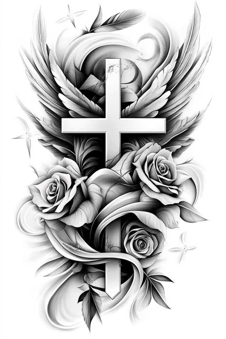 An arresting black-and-grey composition centers a stark cross kissed by two wings and intertwined with three roses, with a curling ribbon weaving through the feathers; the whole is framed by curling leaves that push the eye along a vertical axis. The design is rendered in smooth grayscale shading where high-contrast highlights and soft midtones sculpt the form and give the piece a tactile, lifelike presence. The cross acts as a solid geometric anchor, while the wings convey motion and spiritual ascent; the roses add contrast and tenderness, and the ribbon binds the elements into a cohesive narrative that reads as a tattoo design from afar and rewards close inspection with delicate line work. Leaves frame the arrangement, guiding the eye along the composition and reinforcing the natural flow of the motif. The artist’s use of fine lines for the roses and ribbon contrasts with broader shading for the wings and cross, achieving a balanced tonal gradient that reads well on larger canvases such as the back, chest, or sleeve, yet remains adaptable for smaller placements with careful scaling. This tattoo design speaks to themes of faith, remembrance, and resilience, making it a meaningful choice for someone seeking a strong, timeless image. As an AI-generated tattoo project, it demonstrates how modern algorithms can craft sophisticated black-and-grey silhouettes with mass-appeal symbolism; the result remains legible at distance yet rich in detail up close, inviting personal interpretation. Given the heavy dark elements and the bold silhouette, the piece also serves as an excellent cover-up option to mask older ink while preserving the core imagery, a practical consideration for anyone upgrading a tattoo story. For clients exploring meaningful tattoos, the fusion of cross, wings, and roses provides a versatile canvas for customization, with potential tweaks to scale, line weight, shading, and stippling to suit personal preferences and body contours. In the broader context of tattoo design, this motif aligns with trends in black-and-grey realism, flower tattoos, and religious symbolism, while remaining adaptable to variations such as fine-line or larger statement compositions within the body art tradition, ensuring a timeless versatile tattoo design that communicates faith, beauty, and endurance.