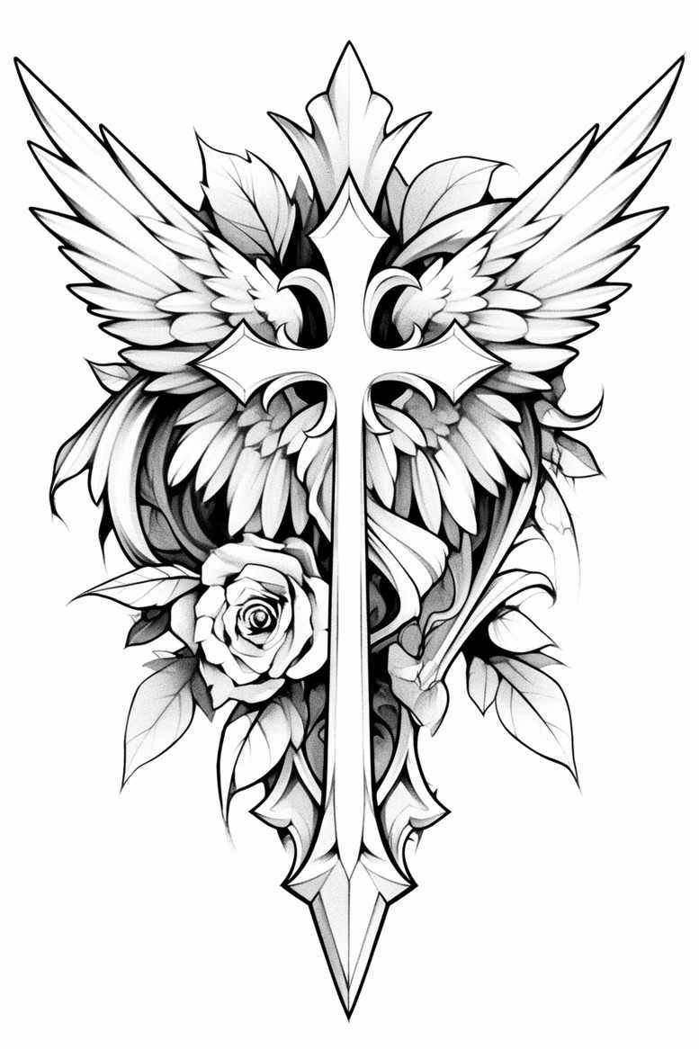 This inked concept centers on a vertical cross-sword motif crowned by expansive wings, with a blooming rose and serrated leaves shaping the composition. Executed in crisp black-and-grey line work, the piece relies on fine-line tattoo technique: precise outlines, soft grayscale shading, and strategic use of negative space to create depth without heavy fills. The central cross forms a spine-like column, its edges accented by cathedral-inspired facets that echo a rosette motif, while the wings unfold as a dramatic, celestial backdrop that frames the blade. A rose sits low in the design, its petals built from delicate gradients that give volume while preserving the overall monochrome aesthetic. Leaves weave around the floral elements, guiding the gaze upward toward the blade’s pointed terminus. The result is a bold yet refined tattoo design with strong visual clarity, making it adaptable to placement on the forearm, shoulder, or chest at various scales. Symbolically, the cross conveys faith and sacrifice, the wings represent protection and transcendence, and the rose embodies beauty and resilience; together they form a meaningful tattoos story suitable for someone seeking a flower-laden, gothic-inspired piece. The pattern-based shading and ornamental edges contribute to a timeless look that remains legible as an inked body art piece over time, and the design is well-suited for a custom tattoo design workflow, whether requested as black and grey or expanded into a subtle color palette. AI-generated tattoo project, crafted to explore high-contrast line density and symmetrical balance, and ideal for clients who appreciate classic religious iconography reinterpreted with modern graphic patterning.