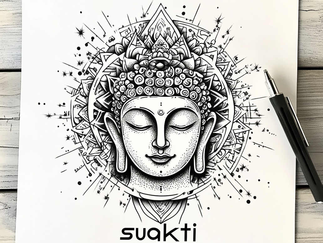 An arresting black-and-grey portrait of a Buddha head encircled by a radiant mandala, rendered in fine line and dotwork that builds texture with stippled shading and delicate negative space. The central figure’s tranquil expression, closed eyes and elongated ears convey serenity, wisdom, and compassion, while the mandala halo expands into geometric petals and bead-like motifs that suggest cosmic order and spiritual radiance. The composition is vertical, with symmetry and balanced weight, allowing easy placement on the arm, calf, or back. The style blends fine line tattoo aesthetics with dotwork shading to achieve a modern, meditative vibe; the repeated geometric motifs create a hypnotic rhythm, a pattern that invites contemplation. In terms of symbolism, the Buddha speaks to enlightenment, inner peace, and detachment from worldly concerns; the mandala represents wholeness and the universe, a map of spiritual journey; together they express meaningful tattoos about mindfulness, self-discovery, and compassion. The black and grey palette enhances the solemn mood and ensures longevity; the crisp lines and restrained shading emphasize form without overpowering the skin, making it suitable for a refined, timeless tattoo design. As a concept, the piece explores how sacred iconography can be adapted into contemporary ink through minimalist linework and celebratory dotwork; it can function as a stand-alone work or a complementary element within a larger body art piece. If used as AI-driven inspiration, the design demonstrates how modern technology can reinterpret ancient motifs while maintaining reverence. For those seeking a versatile piece, this tattoo design offers strong visual impact without excessive clutter, and the repeating mandala pattern is a nod to tradition while remaining fresh and wearable. The artwork is an assistant-driven exploration of sacred iconography and ink, and remains a concept to be refined with your tattoo artist. Note: this is a concept artwork with AI-generated origins and should be treated as a basis for discussion with your artist.