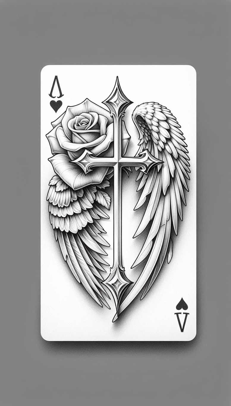 This AI-generated tattoo project presents a bold black-and-grey study that centers a cross interlaced with a blooming rose and expansive wings on a stylized playing card. The cross is decorative, with pointed finials and clean lines that intersect to form a strong vertical axis, while the rose sits at the heart of the composition, its petals shaded with fine gradations to convey velvet depth. The wings sweep along the card’s sides, each feather layered in precise, parallel strokes to create a sense of lift and motion. The card backdrop anchors the piece in classic deck iconography, with subtle corner hints of a heart and spade that read as ornamental details rather than literal suits. The shading alternates between solid blacks and soft grays to maximize contrast on skin, enabling the design to remain legible at a distance while revealing subtle texture up close. The pattern work within the feathers and the petal contours gives the piece a graphic, pattern-heavy character without sacrificing clarity, making it ideal for a cover-up or as a bold standalone statement. The motif blends faith, beauty, and freedom—cross for protection, rose for enduring allure, wings for ascent—creating a meaningful tattoo design with broad appeal for fans of black-and-grey ink, fine line precision, and intricate, symbolic body art. As an AI-generated tattoo project, this concept demonstrates how digital artistry can translate into a highly wearable tattoo; it is particularly well-suited for clients seeking a custom tattoo design that can function as a cover-up thanks to its dense silhouette and dense shading, which can mask prior ink while preserving dramatic impact. Keywords to consider include tattoo, tattoo design, meaningful tattoos, fine line tattoo, rose tattoo design, black and grey, realistic tattoo, and custom tattoo design.