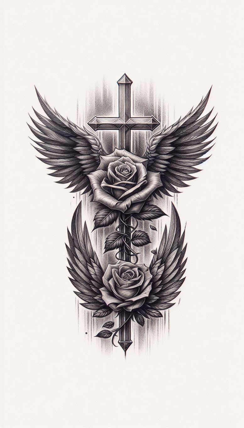 An AI-generated tattoo project featuring a vertical cross with wings and roses, rendered in black and grey. The composition centers on a strong cross, its arms opening into expansive wings that fan outward with layered feather shading. A thorny vine climbs the shaft and blooms into two roses, their petals rendered with subtle gray washes to achieve a lifelike yet graphic look. The artist blends solid blacks with soft gradients to create depth and texture in the feathers, petals, and leaves, giving the piece a realistic feel while preserving crisp lines for enduring ink. The feather pattern and the mirrored rose placement introduce a decorative rhythm that reads well at a distance and up close, making it a striking choice for a tattoo design. Symbolically, the cross stands for faith and endurance; the wings suggest protection and ascent; the roses symbolize love, memory, and renewal. The vertical flow guides the eye along the limb, making the design adaptable to forearm, upper arm, back, or calf, depending on client goals. Because of its dense shading and bold silhouette, this design is particularly suitable as a cover-up, offering substantial opacity to obscure older ink while integrating new meaning. For tattoo enthusiasts and artists seeking a custom tattoo design, it marries classic symbolism with modern black and grey realism, and its strong silhouette makes it a versatile addition to body art portfolios and ink collections. The project aligns with meaningful tattoos, rose tattoo design, and black and grey tattoo trends, while also inviting exploration as a larger piece or a component of a sleeve, with potential for Japanese-style shading and fine-line accent work if desired. It also serves as an example of how AI-generated tattoo projects can produce cohesive, market-ready concepts for both small tatt combinations and larger, cover-up-friendly canvases.