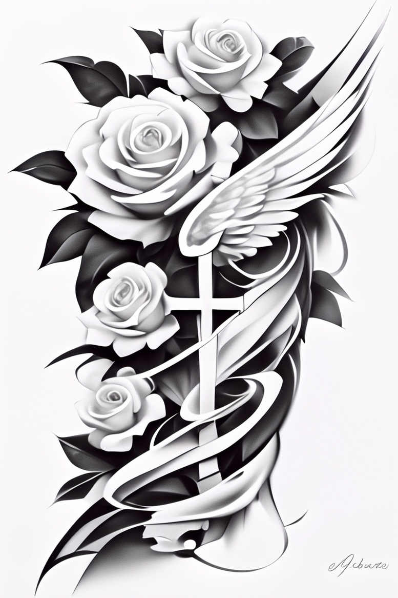 An upscale black-and-grey composition that threads roses with a winged cross and ribbon scrollwork, designed for ink enthusiasts seeking a meaningful tattoo design. This rose tattoo design features a central vertical motif that anchors a cluster of five roses in varying states of bloom, their petals rendered with smooth gradient shading to create a lifelike yet stylized appearance. A stylized wing unfurls along the right side, its feathers carved with careful negative space to imply motion and grace, while a slender cross rises through the composition, its bars intersecting the ribbon that wraps around the stem and leaves. The leaves provide contrast, airbrushed in deep shadow to emphasize depth and realism. The piece demonstrates a balance between organic floral lines and stark geometric forms, merging botanical symbolism with spiritual overtones. In terms of meaning, roses symbolize beauty, resilience, and remembrance; the wing and cross evoke protection, faith, and ascent; the flowing ribbon suggests continuity and journey. The technique leans into black-and-grey realism with fine shading and crisp edges to achieve a tattoo-ready result that translates well on skin as a large, budget-friendly piece or as a bold half-sleeve concept. The design uses clean linework and soft gradients to allow future color insertion if desired, while maintaining legibility at smaller sizes. Given its dark elements and strong silhouette, this project is particularly suitable as a cover-up option for previous tattoos requiring bold masking. As an AI-generated tattoo concept, it showcases modern illustration skills and attention to anatomical flow; this background can be adapted into a custom tattoo design that honors personal symbolism. Ultimately the piece represents a timeless body art motif that blends floral beauty with spiritual symbolism, crafted to remain legible and impactful on the skin, and it can be refined to fit various body contours while preserving the central rose-wings-cross narrative. This makes it a compelling choice for small tattoos or larger body art initiatives, offering a versatile platform for ink enthusiasts to customize a rose motif with wing and cross elements in a black-and-grey palette.