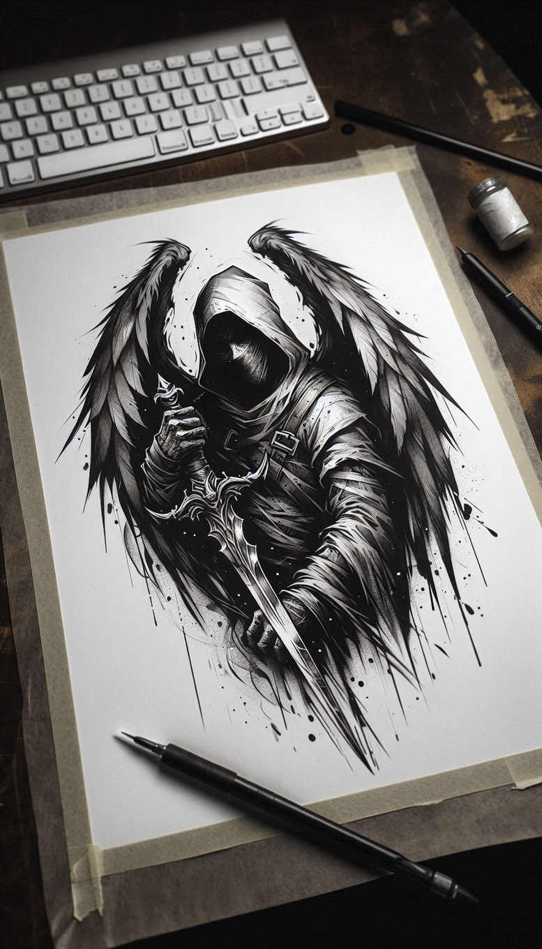 This is an AI-generated tattoo project that explores a dramatic black-and-grey silhouette of a hooded figure with wings and an ornate sword. The illustration centers on a cloaked presence, its face hidden, while expansive wings sweep outward and intersect with the weapon to create a dynamic, cinematic frame. Crisp linework is paired with deep noir shading and selective splatter effects to convey motion and grit, as if the scene were etched onto skin through a single, confident pass of the needle. The folds of the cloak, the buckle, and the creases in the fabric are rendered with cross-hatching and gradient tones that give the image a tactile weight, while the mask remains intentionally minimal to preserve mystery. The composition uses negative space to emphasize the blade’s arc and the tension between light and shadow, allowing this piece to adapt to placements on the shoulder blade, forearm, or chest. Symbolically, the hooded figure can represent protection or retribution, wings suggest ascent or guardianship, and the sword stands for courage and decisive action; together they form a meaningful tattoo design with enduring resonance for those seeking strong, monochrome body art. The project demonstrates how AI-generated concepts translate into refined tattoo designs suitable for a range of applications, including small tattoos or larger pieces, and how black and grey ink can retain detail even in a cover-up scenario when older work needs obscuring beneath a bold silhouette. It also showcases the potential of graphic patterns and splatter textures to enhance drama while remaining practical for skin healing, making this a compelling example of modern tattoo design, ink technique, and the evolving relationship between technology and body art. The imagery nods to Japanese style ink sensibilities through clean silhouette and deliberate negative space, expanding its versatility for various placements and seizing the possibilities of a pattern-driven, meaningful tattoo.