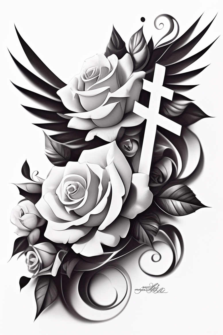 AI-generated tattoo concept, this grayscale study centers a cross entwined with roses and winged accents, conceived as a versatile tattoo design that reads clearly on skin and ages well. The focal element is a bold Latin cross whose edges are carved with precise line work, then softened by gradients that blend into surrounding shading for a tangible three-dimensional feel. On the left and lower portions, several roses unfurl with layered petals, each bloom built from subtle tonal shifts from near-white highlights to deep graphite shadows, preserving legibility while suggesting realism. Behind and around the floral core, sweeping wing shapes radiate outward, their feathered arcs adding motion and a contemporary edge that fits black and grey realism rather than color-heavy styles. Leaves and curling tendrils weave through the composition, creating negative space pockets that keep the design balanced across different body areas and sizes. The technique emphasizes graduated value scales, soft edge transitions, and crisp contrast to maintain clarity whether ink is seen up-close or from a distance. Symbolically, the cross anchors faith or memory, the roses speak to love and resilience, and the wings imply protection and ascent, yielding a tattoo with meaning suitable for personal memorials, tribute pieces, or wearable symbolism within a sleeve or small tattoo. From a practical standpoint, the monochrome palette supports timeless ink longevity, easy touch-ups, and faithful reproduction by tattoo artists, while the combination of floral realism with graphic cross elements invites a refined yet bold silhouette. This AI-generated concept demonstrates how digital drafting can inform traditional tattoo design workflows, offering a polished template that can be customized to skin tone, anatomy, and personal narrative in a black and grey, realistic tattoo style.