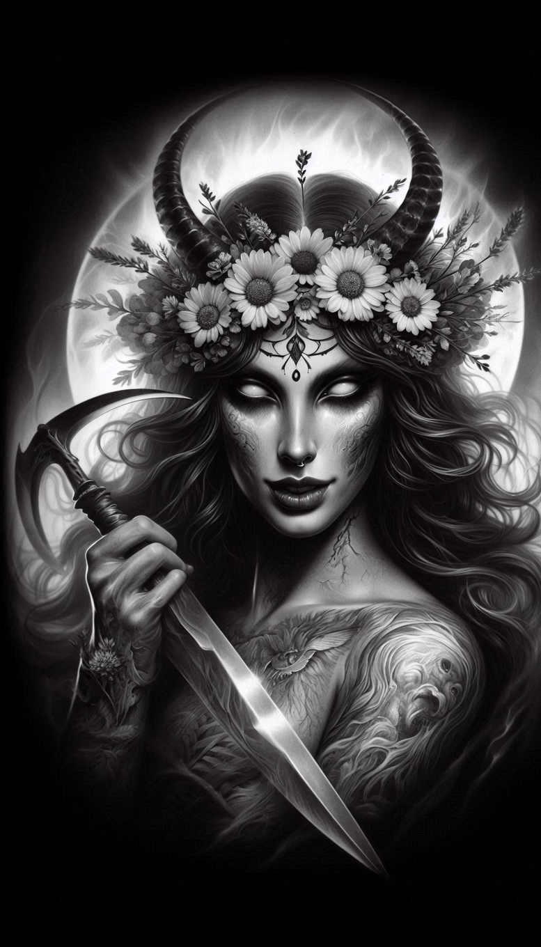 AI-generated concept for a Morana-inspired tattoo design presents a poised female figure at the center, her direct gaze framed by a crown of daisies that repeats into a soft floral motif around the head. Rendered in black and grey, the piece uses meticulous shading to sculpt the face, neck, and hands while the cloak and surrounding darkness dissolve into velvety graphite shadows. In her right hand the dagger catches a pale gleam, a symbolic blade that marks transition, winter’s edge, and the rite of seasonal change. A slender crescent moon rises behind, reinforcing lunar symbolism and the timeless cycle of life and death. The crown’s symmetrical petals create a repeating pattern that can seamlessly extend into a sleeve or back piece, offering a built-in decorative rhythm for a larger work. The character embodies Morana, the Slavic winter goddess associated with cold, transformation, and rebirth; the tattoo speaks of meaningful tattoos that honor heritage and personal renewal. The composition balances realism with stylized line work, achieving a refined fine line tattoo look while retaining bold negative space and strong silhouettes characteristic of black and grey ink. The piece is presented as a concept project with cover-up potential: the rich shading and dense forms provide excellent camouflage for earlier tattoos while letting a new mythic story emerge. As an AI-generated design, it demonstrates how mythic identity can be captured in contemporary body art—combining historical symbolism with modern technique. For clients seeking a custom tattoo design that conveys endurance and cyclical change, this Morana-inspired concept delivers a cinematic narrative, a durable silhouette, and a timeless beauty suitable for placement on the forearm, shoulder blade, or back, with room for personalization in petal curvature, blade style, and lunar accent. The repeating floral pattern of the crown invites texture exploration and can be tuned to a finer line for wrist or ankle pieces, while the sword’s geometry anchors the composition for a bold, statement tattoo that remains legible at smaller scales.