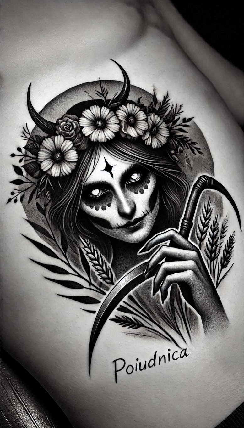 This Morana-inspired winter death tattoo design is rendered in black and grey realism, presenting a central skull-faced female figure whose hollow eyes and shadowed features convey mortality with a haunting elegance. A crown of daisies and small blossoms sits atop the head, a symbolic marriage of life and renewal that nods to Morana, the Slavic goddess of winter and the cycle of death and rebirth. Surrounding elements—delicate branches and a feathered wing—create a natural frame that emphasizes the dichotomy between light and darkness, as well as the inevitability of change. The composition balances a dense focal point at the skull with lighter negative space around the crown and wing, guiding the viewer’s eye through repeating floral motifs that function as a built-in pattern, echoing themes of continuity and renewal. The shading is carefully graded, with crisp linework defining the skull, petals, and leaves, while soft shading adds depth to create a lifelike yet stylized appearance suitable for wearable body art. As a meaningful tattoo, the piece conveys mortality, resilience, and the seasonal transition from winter to spring, aligning with keywords such as tattoo design, meaningful tattoos, flower tattoos, black and grey, and realistic tattoo. The crown’s repeating flowers contribute a subtle pattern element that enhances the design’s rhythm and memorability, making it an excellent canvas for those seeking a cover-up due to its dense blacks and intricate detailing. This is a high-quality, AI-generated concept that can be refined into a final custom tattoo design to suit individual anatomy and preferences, while preserving the mythic symbolism of Morana and the enduring appeal of dark-romantic aesthetics.