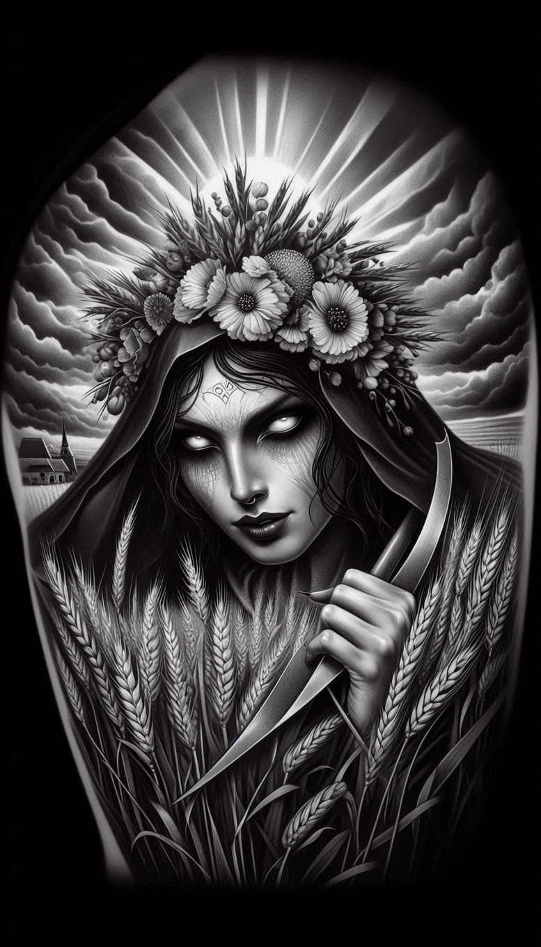 This tattoo design presents a grayscale portrait of a Slavic goddess-like figure, imagined as a Lada-inspired embodiment of beauty, spring, and renewal. The central figure is a poised woman whose calm gaze anchors the composition, her features shaded with soft realism and defined by a restrained linework that suits black and grey tattoo aesthetics. She wears a lush flower crown, comprised of repeating blossoms that create a rhythm along the brow and crown line, evoking seasonal rites and the feminine cycle. A hooded cloak or mantle drapes over her shoulders, its texture built from feather-like strokes and dense black shadows that contrast with the lighter skin tones hinted beneath. The overall silhouette reads as both intimate and monumental, with the crown and cloak forming a dynamic frame that guides the eye from the forehead to the chest. In terms of symbolism, the piece fuses beauty and sovereignty: the flower crown signifies life, fertility, and renewal; the goddess identity nods to ancestral memory and protective feminine power; the feathered cloak hints at metamorphosis, transcendence, and the veil between worlds. For tattoo enthusiasts seeking meaningful tattoos, this design offers a narrative-rich image suitable for large-scale placements such as back, chest, or sleeve, while remaining adaptable to smaller canvases through selective detailing in the crown and hair. The grayscale palette makes it versatile across skin tones, enhancing legibility of the repeats and textures in the crown, hair, and cloak, and supporting long-term durability of the ink. The repeating floral motif functions as a pattern element that reinforces unity throughout the piece, while the high-contrast shading ensures readability on a dark skin tone or when used as a cover-up tattoo. This concept demonstrates a contemporary approach to custom tattoo design that respects Slavic myth while delivering a timeless, magazine-quality aesthetic; it is presented as an AI-generated concept intended for refinement with a client’s anatomy and preferences.