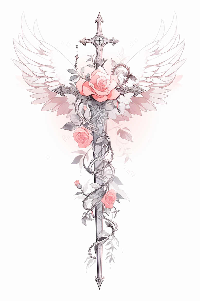 AI-generated tattoo concept featuring a central sword wrapped by vines, crowned by a pink rose on the guard and another bloom along the blade, with expansive wings unfurling behind in a soft pastel palette of pinks and grays. Fine-line outlines define feather detail in the wings, the cross-like hilt, and the twisting stems, while gentle gradients add depth without bulk, creating a delicate yet legible image suitable for long-term body art. The vertical blade, the cross motif at the guard, and the entwining vines symbolize resilience, faith, and growth, while the roses convey renewal and love. This design pairs floral tenderness with a martial silhouette, ideal for a tattoo design on forearms, upper arms, or back pieces. Although rendered in color rather than black and grey, it preserves crisp line work and contrast, and aligns with fine line tattoo aesthetics and botanical motifs, including influences from Japanese style tattoo through composition and botanical detailing. The piece works well as rose tattoo design, flower tattoos, and can be adapted into a custom tattoo design for meaningful tattoos, including options with lotus flower motifs or infinity accents. It is presented here as an AI-generated tattoo project for inspiration, suitable for clients seeking a soft, romantic alternative to harsher imagery, and offering potential cover-up versatility when scaled to larger canvases.