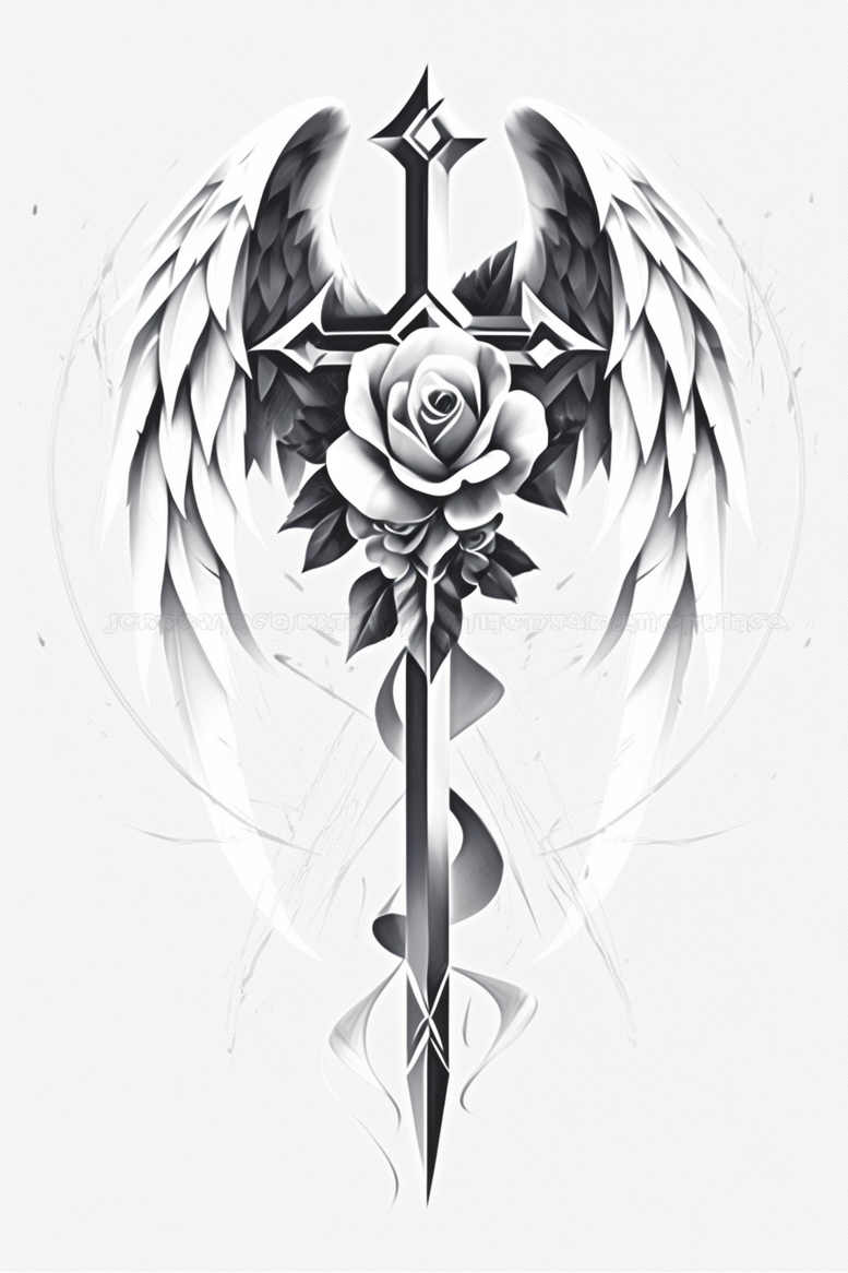 This is an AI-generated tattoo project rendered in black and grey realism. The design centers a blooming rose at the heart, with a vertical sword piercing the composition and wings unfurled behind it, creating a dynamic halo of movement. Leaves frame the rose while a curling ribbon trails downward, guiding the eye along the blade while adding a sense of flow. The piece employs smooth gradient shading and crisp linework to produce depth and a lifelike look, ensuring the main motifs read clearly on skin as a strong standalone tattoo design and adaptable for a cover-up if placed over an existing mark. Symbolically, the rose embodies beauty and resilience; the wings signify freedom and ascent; the sword represents protection and strength. Together they narrate growth through adversity and a steadfast spirit. The composition balances negative space with solid ink, allowing it to scale from small tattoos to larger pieces while preserving legibility and detail. The black and grey palette emphasizes form over color, delivering a timeless, realistic tattoo vibe that suits meaningful tattoos and custom tattoo design across styles, including subtle nods to Japanese influences without sacrificing realism. This AI-generated concept demonstrates how digital design can inspire tattoo projects, offering durable linework, nuanced shading, and bold symbolism for body art enthusiasts seeking a meaningful, enduring ink. For those pursuing meaningful tattoos, the motif blends classic rose tattoo design with motion and heraldic mood, suitable for ink lovers who value longevity and versatility.