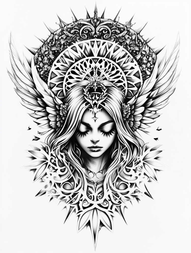 Designed as an AI-generated tattoo project concept, this black and grey illustration presents a serene female portrait crowned by a radiant mandala halo and flanked by spread wings. The central figure’s eyes are closed, conveying introspection, while the hair flows in polished strands that intertwine with ornate filigree and geometric motifs. The mandala crown sits like a celestial halo, composed of radial spokes and lace-like cutouts that invite negative space around the edges, making the piece read as both sacred and contemporary. Surrounding the head are stylized feathers that extend into expansive wings, creating a dynamic silhouette that balances delicate line work with bold silhouettes. The lower portion of the design is filled with intertwined ornamental patterns—curls, arcs, and pointed acanthus-like shapes—that frame the neck and chest area in a symmetrical, jewel-like arrangement. The overall effect relies on fine-line tattoo technique, where crisp lines create intricate detail without heavy shading, resulting in a graceful black and grey aesthetic suitable for a large back piece or a chest design, yet adaptable for smaller placements through strategic composition. Symbolically, wings often signify freedom and transcendence, while the mandala halo can represent unity, balance, and spiritual journey; together they propose a meaningful tattoo design about inner strength, protection, and personal growth. This design also showcases how pattern work can carry a cohesive motif across a body canvas, with repeating motifs tying the upper and lower elements into a single narrative. For seekers of small tattoos or body art enthusiasts, the piece demonstrates how a complex concept can be rendered with precision and care through a custom tattoo design approach, using Japanese-inspired line work influences, refined black and grey shading, and a focus on negative space to preserve clarity. While the image is a concept for an AI-generated tattoo project, it embodies timeless themes of beauty and resilience, and its intricate patterning invites tattoo collectors to consider it as a standalone piece or as a complementary element in a larger sleeve. In sum, this design emphasizes fine line tattoo craft, modern patterning, and symbolic depth—an ideal reference for tattoo studios exploring meaningful tattoos, from lotus flower motifs threaded into the halo to infinity-inspired curves that echo a personal story.