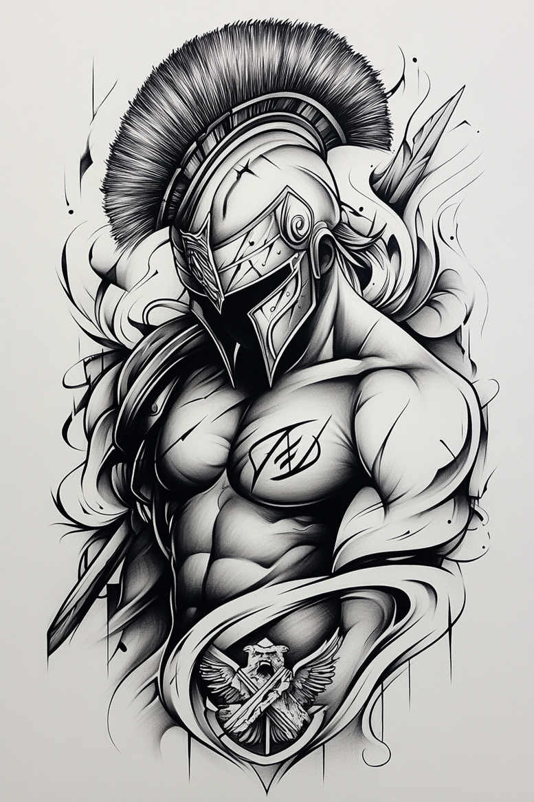 This AI-generated tattoo project presents a Spartan warrior motif captured in a bold black-and-grey palette, designed for a chest tattoo with maximum impact. The composition centers on a sculpted male torso, the chest crowned by a detailed Corinthian helmet with a dramatic plume that arcs above the shoulder line. The helmet is rendered with crisp linework and high-contrast shading to convey metal, depth, and a sense of weight. A shield crest with an eagle and crossed weapons anchors the lower portion of the design, offering a heraldic focal point that balances speed and stillness. Surrounding swirls and brush-like extensions provide motion, guiding the eye from helmet to chest to crest while leaving plenty of negative space to ensure readability on different skin tones. The technique blends fine line tattoo precision with broad, smooth washes of black ink to create a three-dimensional effect without color, achieving a realistic tattoo feel in a graphic, almost ink illustration style. The overall silhouette emphasizes strength, discipline, and ancient warrior ethos, with the helmet symbolizing protection and courage, and the eagle crest evoking vigilance and nobility. While the piece reads as a bold chest piece, its careful shading and line weight allow it to evolve with wear and age, making it suitable for a cover-up when concealing an existing tattoo while preserving a strong visual statement. The design also nods to Japanese-style tattoo principles of clean outlines and controlled gradations, reinforcing a modern, timeless aesthetic that fits within the spectrum of tattoo design trends, including black and grey realism, tribal-inspired contrasts, and fine line precision. As an AI-generated tattoo project, it illustrates how digital creativity can inform classic tattoo design while offering meaningful tattoos that double as confident body art, with the potential to be adapted to different sizes and placements, including small tattoos for subtle statements or larger, more expressive pieces on the chest. In short, this image represents a high-impact, monochrome tattoo concept that blends historical symbolism with contemporary technique, ideal for both personal meaning and professional portfolio work, and it remains highly relevant to ink enthusiasts seeking a refined, durable design that stands the test of time.