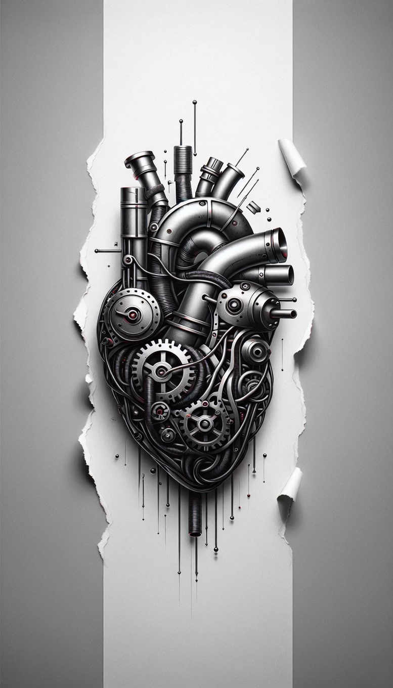 This piece presents a hyper-detailed steampunk heart formed from interlocking gears, tubes, and pistons, embedded in shredded paper as if bursting from a torn page. The design is rendered in black and grey with high-contrast shading to emphasize metallic surfaces, knurled textures, and riveted joints. The composition centers on a rounded heart-shaped apparatus, with circular gears of varying sizes connected by pipes and cables, creating a dense circuit-like network that conveys motion and energy. Subtle hints of red may appear in rivet heads for accent, but the overall palette remains monochrome to suit classic tattoo aesthetics and longevity. The piece reads as a mechanical anatomy study, blending engineering precision with organic form. It works particularly well as a stand-alone sleeve or forearm project, but also serves as an ideal cover-up design due to its bold silhouette and dense linework. The torn paper edge adds depth and a sense of discovery, inviting the viewer to imagine the inner workings beneath the skin. The style leans toward realistic tattoo execution, with smooth gradations, crisp line quality, and metallic reflections captured through careful contrast and stippling. Symbolically, the heart motif suggests resilience, invention, and the fusion of man and machine—an homage to perseverance and creative problem-solving. As an AI-generated tattoo project, it demonstrates the potential of digital artistry in planning complex bodies of work, and can be adapted into a custom tattoo design by a skilled artist. This piece embraces the vocabulary of tattoo design: black and grey realism, mechanical detailing, and a pattern-rich composition suitable for meaning-driven ink that can be scaled to different body areas. Keywords integral to discovery include tattoo, tattoo design, meaningful tattoos, fine line tattoo, lotus flower tattoo, infinity tattoo, tribal tattoo, rose tattoo design, small tattoos, flower tattoos, custom tattoo design, Japanese style tattoo, black and grey, realistic tattoo, body art, ink.