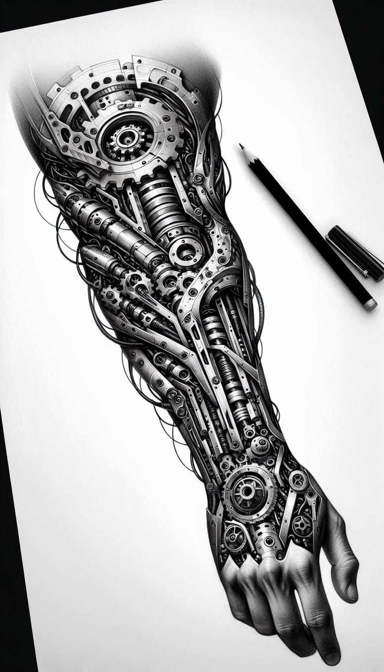 AI-generated tattoo project presenting a hyper-detailed black and grey mechanical arm, designed to resemble an exposed robotics forearm. The composition layers interlocking gears, pistons, cables, and screws along the entire arm, with precise line work and dramatic shading to create depth and the illusion of metallic surfaces. The design blends organic anatomy with industrial hardware, producing a striking contrast between smooth skin-toned negative space and dense sections of machinery. Key elements visible include the forearm and hand enmeshed with circular gears, elongated pistons, multi-stranded cables, and small riveted screws, all rendered in black and grey to achieve a realistic tattoo look. The artwork relies on high-contrast chiaroscuro to emphasize light reflections on chrome, beveling edges, and the intricate negative spaces that form a pattern across the limb. This pattern is evident in the repeating circular motifs and linear supports that guide the eye from wrist to elbow. As a custom tattoo design, it offers a bold statement about strength, resilience, and the fusion of man and machine, making it ideal for meaningful tattoos for fans of cybernetic aesthetics. The piece is well-suited for a cover-up due to its dense composition and dark tones, which can mask underlying tattoos or blemishes while providing a cohesive new image. Produced as an AI-generated tattoo project, it showcases meticulous texture, gear geometry, and cable work that underscore the craft of modern body art. In sum, this is a realistic black and grey tattoo design that could function as a standalone forearm piece or as a segment in a larger mechanical sleeve, with potential for ink-conscious customization and long-lasting impact online.