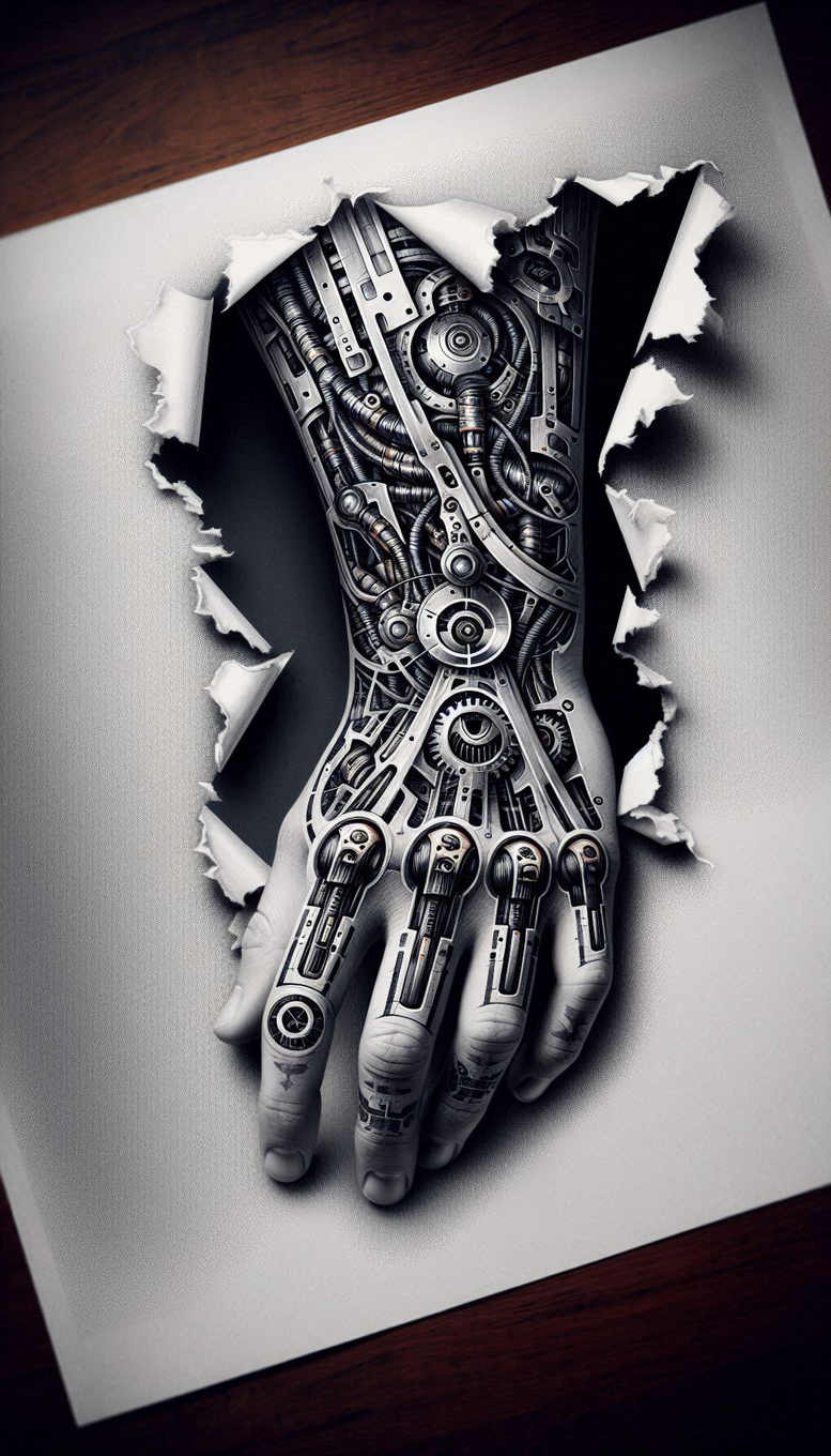 This AI-generated tattoo project presents a hyper-detailed study of a mechanical hand rendered in black and grey, with interlocking gears, pistons, and linkages that mimic real anatomy. The composition appears to tear through a surface, revealing a dense inner machinery and suggesting themes of cybernetic augmentation and resilience. The design relies on fine line work and high-contrast shading to create depth and a metallic gleam, ensuring each gear interlocks with its neighbor to form a seamless flow from wrist to fingertip. Visually, the piece juxtaposes solid shadows with crisp line weights to evoke a realistic machine texture while maintaining the intimate scale of a tattoo. Symbolically, the hand speaks to power, precision, and the fusion of human intent with engineered systems; as a meaningful tattoo, it can symbolize resilience, adaptability, and the intersection of art and technology. The motif sits within a black and grey palette, emphasizing a graphic pattern created by repeating cogs and plates, which enhances the piece’s rhythm and readability as a tattoo design. For clients, the design translates well to skin through careful line density and shading, offering a robust option for cover-up applications or existing dark ink. Technique details include grayscale gradient shading, precise micro lines, stippling for texture on metal surfaces, and negative space along the wrist to enhance depth. The mechanical aesthetic nods to industrial design and cyberpunk influences, with a torn-paper framing that suggests a window into a hidden kit of parts. In practice, this piece can be scaled for a forearm, hand, or integrated into larger sleeve compositions while preserving its legibility as a stand-alone tattoo design. This description weaves in SEO terms such as tattoo, tattoo design, meaningful tattoos, fine line tattoo, lotus flower tattoo, infinity tattoo, tribal tattoo, rose tattoo design, small tattoos, flower tattoos, custom tattoo design, Japanese style tattoo, black and grey, realistic tattoo, body art, and ink. The project also notes its AI-generated origin, illustrating how digital concepts can inform durable, expressive body art and ensuring the result remains suitable as a cover-up if needed.