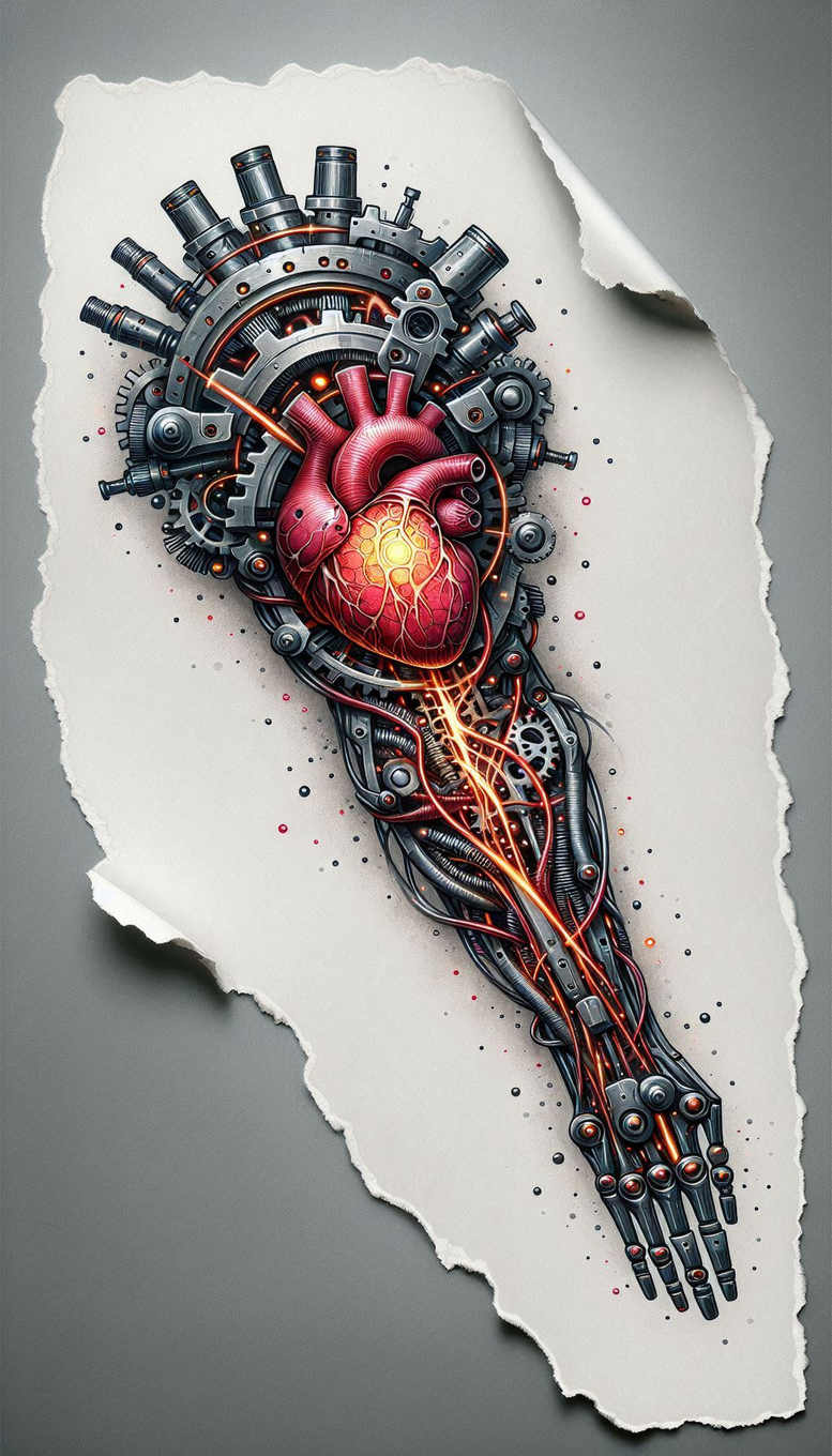 Biomechanical Heart is a color-rich tattoo design that fuses anatomy with engineered machinery, as if a living organ had been peeled from the body and rebuilt in metal. At the center sits a glossy heart in vivid reds and amber highlights, its muscular texture hinted by subtle venation and a life-like gloss. Surrounding it is a circular lattice of gears, pistons, cables, and connectors in steel blues and gunmetal, forming a mechanical backbone that extends into a stylized forearm. The orange circuitry traces through the limbs and into the heart, creating a warm glow that contrasts with the cool metallic surfaces and adds a pattern-like rhythm to the piece. The torn-paper backdrop heightens the contrast between organic warmth and industrial precision, while the composition emphasizes a transition from skin to machine—a common motif in biomechanical tattoo aesthetics. The color strategy blends saturated primary hues with tempered metallics, achieving a realistic skin-tone interplay and a convincing sense of depth via careful edge control and layered shading. Symbolically, the union of heart and machine represents resilience, adaptation, and the fusion of humanity with technology in a contemporary body art narrative. For tattoo collectors seeking meaningful ink, this concept delivers bold visual impact and a narrative of transformation, with crisp linework, meticulous color gradients, and a tactile sense of depth that rewards close inspection. Placement options include the chest, shoulder, or forearm, with scalable size to preserve the central feature while balancing overall composition. In terms of style, it sits at the intersection of realism and graphic mechanical illustration, with a pattern-like rhythm created by repeating gears and segmented tubes. The result is a striking, pattern-driven tattoo design that marries modern technology with timeless anatomy, suitable for those who love both detail and story in ink, and it demonstrates how precision shading and color layering can render a highly realistic biomechanical scene.
