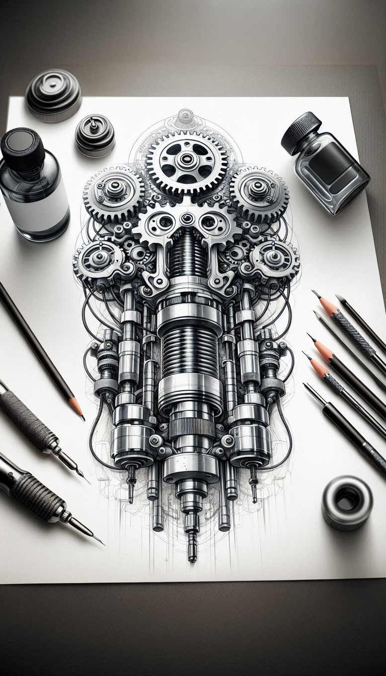 This AI-generated tattoo project concept translates the precision of engineering into wearable body art. The composition centers a towering assembly of gears, pistons, and interlocking components drawn in black and grey linework on a clean white sheet. Meticulous cross-hatching and micro-detailing simulate the gleam of metal, creating a realistic sense of depth and mechanical motion. The design embraces the fine line tattoo ethos, with slender contours that maintain clarity when scaled to a forearm sleeve or back piece, while the bold interlocking gears provide strong negative space for subtle shading. The central axis resembles a turbine or hydraulic stack, flanked by smaller gears and connecting rods that weave into an intricate lattice of tubes and screws, all held together by a column of cylindrical segments and pistons that evoke motion and force. A soft halo of graphite suggests reflected light along curved surfaces, enhancing the perception of three-dimensionality even on skin. The surrounding tools—ink bottles, pencils, and drawing pens—frame the concept as a studio study, underscoring that this is a tattoo design concept ready for adaptation into skin art or a larger composition. The mechanical motif can symbolize time, precision, resilience, and the collaboration between human ingenuity and machinery, making it a meaningful tattoo choice for lovers of industrial, cybernetic, or Japanese-inspired aesthetics. While rooted in grayscale, the piece invites variations such as a full sleeve, chest panel, or back piece by translating textures into black and grey shading and preserving the pattern-like repetition of gears. In terms of style, the design leans toward realistic black and grey linework, with potential for color accents if desired, and it aligns with trends in small tattoos, flower tattoos, and custom tattoo design fans who appreciate technical artistry and meaningful tattoos. This description also nods to the broader interest in pattern-based compositions that rely on rhythm, symmetry, and the interplay of light and shadow to convey motion, making it a versatile blueprint for ink artists.