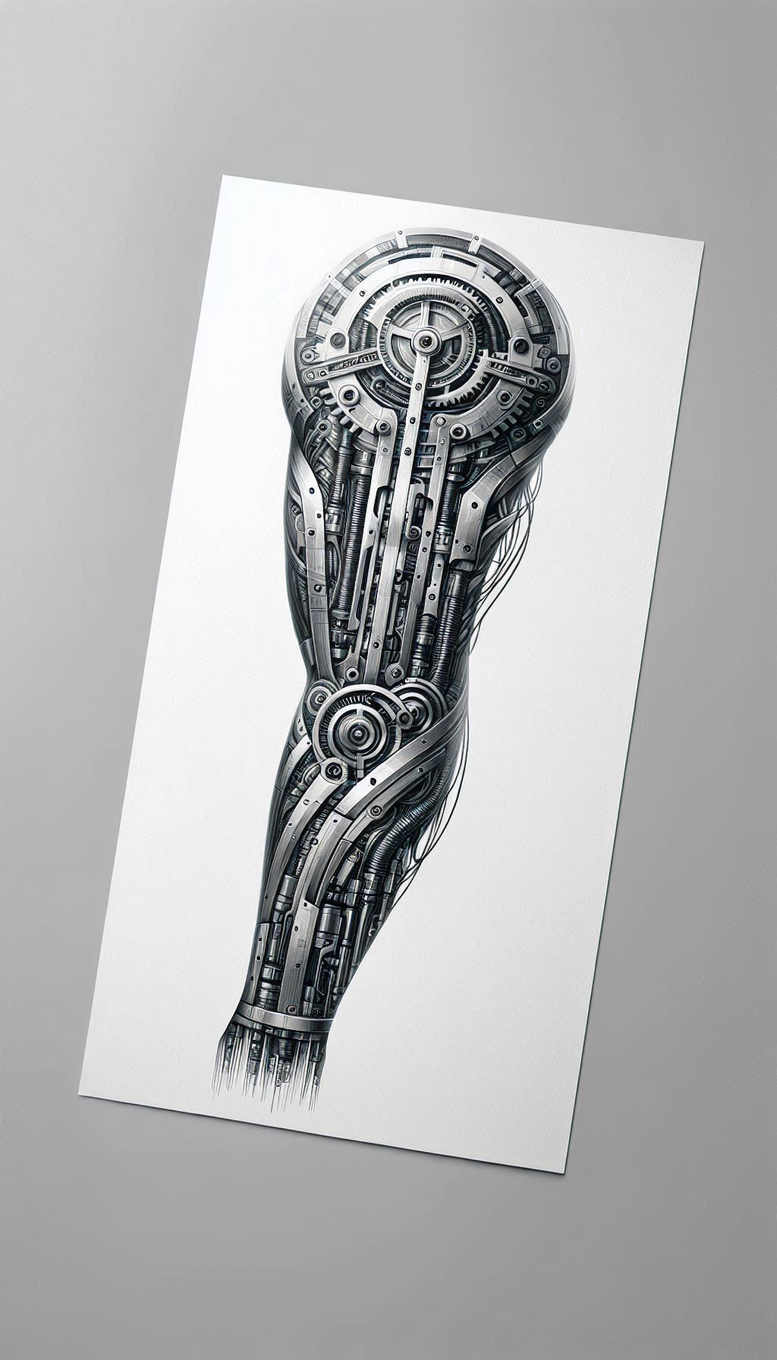 An AI-generated tattoo project, this black and grey mechanized arm design unfolds as a precise ballet of gears, plates, and cables that weave along the forearm to form a seamless cybernetic limb. The grayscale shading builds depth across metallic ribs, pistons, and interlocking rings, with fine-line highlights delivering a tactile sense of chrome and brushed steel. The central elbow hub anchors the composition while elongated tracks of metal plates stretch down the arm, connected by a web of wires that taper toward the wrist. The piece embraces biomechanical tattoo aesthetics, balancing mechanical precision with the organic contour of the limb to mimic real musculature beneath the surface. It is crafted for a bold, high-contrast look that remains legible at scale, making it an excellent choice for a full sleeve or half-sleeve, and particularly well suited as a cover-up where dense shading can obscure previous marks. The design invites interpretation—machines as an extension of the body—while remaining a classic black and grey tattoo, with potential for subtle color accents if desired. As a tattoo project, it aligns with themes of technology, resilience, and transformation, and it pairs well with broader motifs like infinity, geometric pattern, or Japanese-inspired line work if the client desires. The piece demonstrates rigorous technique: clean line work, smooth gradient shading, and realistic metallic textures to create a convincing three-dimensional impression on skin. Keywords: tattoo, tattoo design, meaningful tattoos, fine line tattoo, lotus flower tattoo, infinity tattoo, tribal tattoo, rose tattoo design, small tattoos, flower tattoos, custom tattoo design, Japanese style tattoo, black and grey, realistic tattoo, body art, ink.