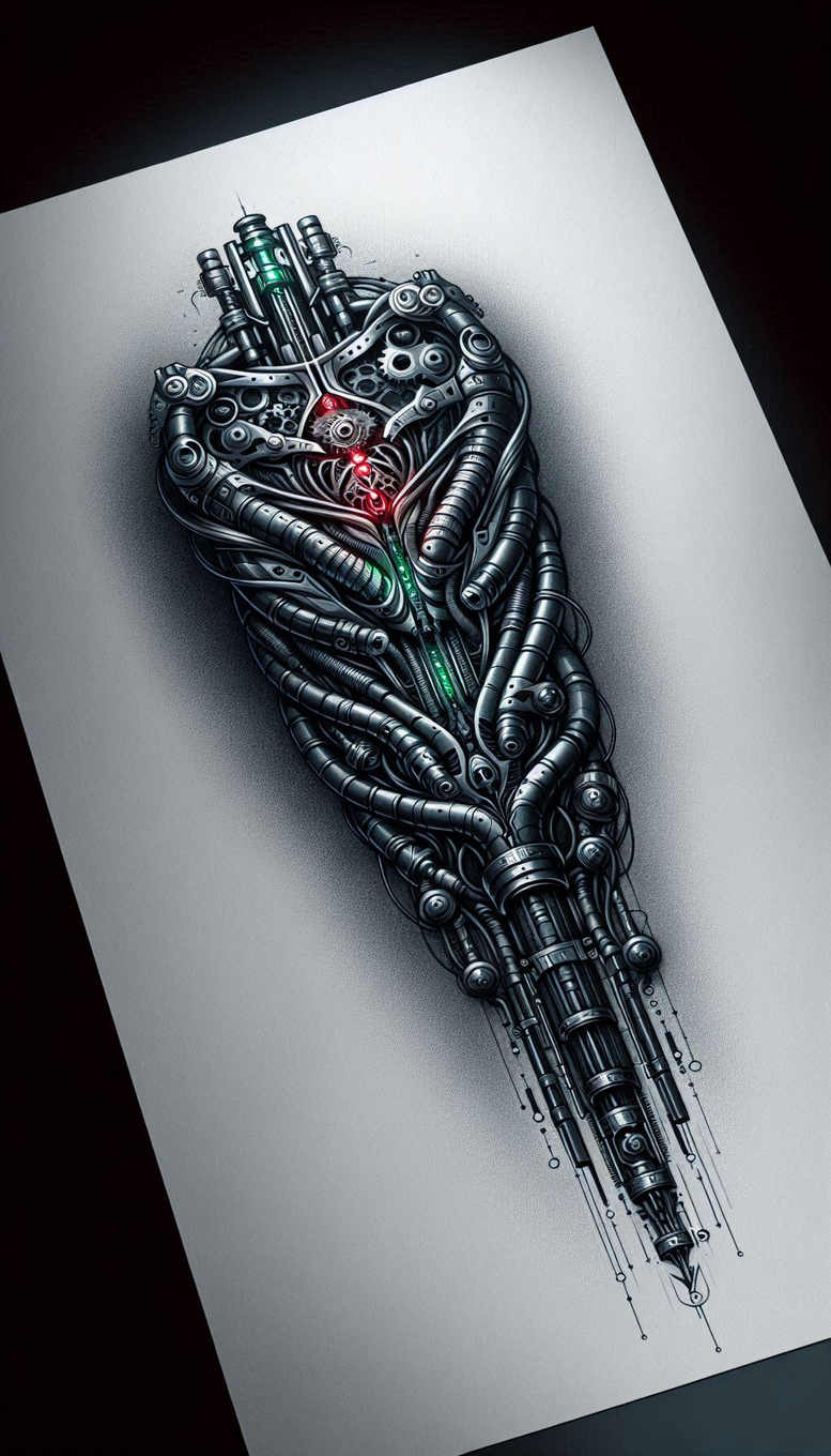 This AI-generated tattoo project presents a hyper-detailed cybernetic hand, assembled from interlocking tubes, gears, and pistons that trace the shape of a lifelike limb. The piece is executed in black and grey with careful shading, creating a high-contrast illusion of depth as metallic surfaces reflect imagined light. Prominent features include elongated cylinders and connectors running along the palm and fingers, exposed gears, cog wheels, and threaded tubes that converge toward a sharpened tip that hints at an integrated tool rather than mere anatomy. Subtle color accents—green LEDs along the forearm and a blood-red core—provide focal points without breaking the monochrome palette, enhancing depth and suggesting a living machine. The overall composition presents a dense, machinery-driven silhouette that remains readable as a single cohesive object, making it a strong candidate for a large-scale cover-up tattoo if placed on a forearm or upper arm. The piece leans toward a futuristic biomechanical aesthetic, blending industrial motif with anatomical rhythm to evoke themes of augmentation, resilience, and identity. From a technical perspective, the design uses crisp linework, smooth gradients, and deliberate negative space to balance mechanical complexity with legibility. The arrangement of pipes, cables, and plates creates a sense of motion as if the hand is reaching or assembling itself. In terms of symbolism, the mechanical heart at the center—red core surrounded by rotary gears—suggests the fusion of humanity and technology, a common motif in meaningful tattoos and custom tattoo design. While the image reads as a stand-alone concept, it translates well into a real tattoo design that can be scaled, adapted to different body placements, and rendered in black and grey or with selective color highlights if desired. Given its dense, dark composition, it also presents excellent cover-up potential for concealing older work beneath a new biomechanical narrative; the pattern-like repetition of mechanical elements reinforces the idea of a cohesive, modern body art statement. Ultimately this piece embodies the intersection of art and engineering, offering a striking, durable option for someone seeking a bold, statement-making tattoo design that remains versatile across styles such as Japanese-inspired or realistic cybernetics, while remaining anchored in the broader world of ink.