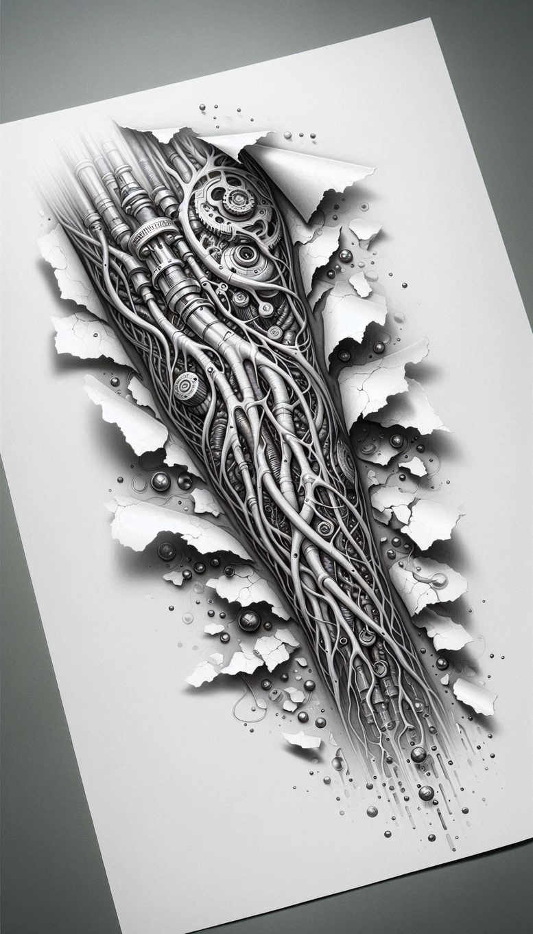 This is a detailed AI-generated tattoo project concept in black and grey, presenting a biomechanical tessellation of gears, cables, and tubes that spill from a torn sheet of white paper. The central mass of mechanical parts forms a dense core of interlocking rings and pistons, around which serpentine conduits arc and braid, creating an illusion of depth and motion. Fine lines define the slender cables, while smooth gradients render the metallic surfaces, producing a hyper-realistic feel that reads as skin-worn machinery. The torn edges framing the composition act as a stage for the internal architecture, suggesting a hidden engine beneath the surface, ready to emerge as a dramatic cover-up piece for an older tattoo or scar. The piece relies on contrast between crisp highlights and deep shadows to emphasize texture, with gears and tubing acting as symbolic motifs for resilience and transformation. This tattoo design resonates with themes of strength, ingenuity, and metamorphosis, appealing to fans of industrial, biomechanical, and Japanese-inspired aesthetics, and it can be adapted to forearm, chest, or back placements as a statement piece or a meaningful tattoo. When used as a cover-up, the dense line work and pattern-like structure help obscure underlying marks, while the grayscale palette lends timelessness and versatility. The concept embraces the language of pattern and texture, inviting the wearer to explore notions of inner machinery—the body as a living mechanism—through art that balances precision engineering with organic movement. In the wider spectrum of tattoo culture, tattoo design, meaningful tattoos, fine line tattoo, lotus flower tattoo, infinity tattoo, tribal tattoo, rose tattoo design, small tattoos, flower tattoos, custom tattoo design, Japanese style tattoo, black and grey, realistic tattoo, body art, ink, this AI-assisted draft demonstrates how computational creativity can translate complex ideas into ink-ready visuals that maintain technical fidelity and expressive energy.