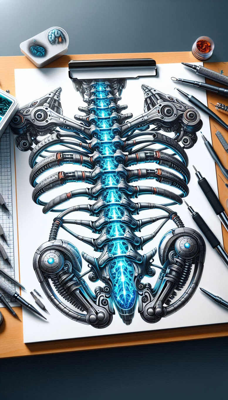 This image presents a highly technical, futuristic tattoo concept: a central spine rendered as a gleaming metallic column with luminous blue energy running along interlocking vertebrae, flanked by articulated tubes and gears. The piece fuses black and grey shading with electric blue highlights to create depth and the illusion of circuitry beneath skin. The drawing is executed with precise line work and crisp mechanical detailing to evoke a biomechanical or cybernetic aesthetic. Visible elements include a prominent spine, tubular conduits, gears, and angular hardware that suggest a fusion of anatomy and machinery. The composition relies on symmetry and rhythm, with repeating spinal modules and curved hoses that generate motion and balance. This is a concept art piece that works well as a large-scale tattoo design, particularly for covering up an older tattoo or scar, thanks to dense line work and dark shadows that can be leveraged to mask previous ink. The technique demonstrates controlled shading, bold outlines, and subtle gradations, where black and grey gradients contrast with neon-blue accents to simulate illuminated circuitry and high-tech metal surfaces. For someone seeking a meaningful tattoo, the cybernetic backbone motif can symbolize resilience, transformation, and the union of human and machine. In terms of execution, the design leans toward a fine line tattoo approach for precision while maintaining robust structure to read well on skin as a body art piece. The piece nods to biomechanical, tribal, and Japanese style influences, yielding a futuristic yet wearable composition that suits readers who collect mechanical or sci-fi themed ink. This description is an AI-generated tattoo project concept, illustrating how digital drafting informs real-world ink and demonstrates the potential of custom tattoo design for pattern-rich, statement-making body art. Keywords to optimize search include tattoo, tattoo design, meaningful tattoos, fine line tattoo, cybernetic, spine, lotus flower tattoo, infinity tattoo, tribal tattoo, rose tattoo design, small tattoos, flower tattoos, custom tattoo design, Japanese style tattoo, black and grey, realistic tattoo, body art, ink.