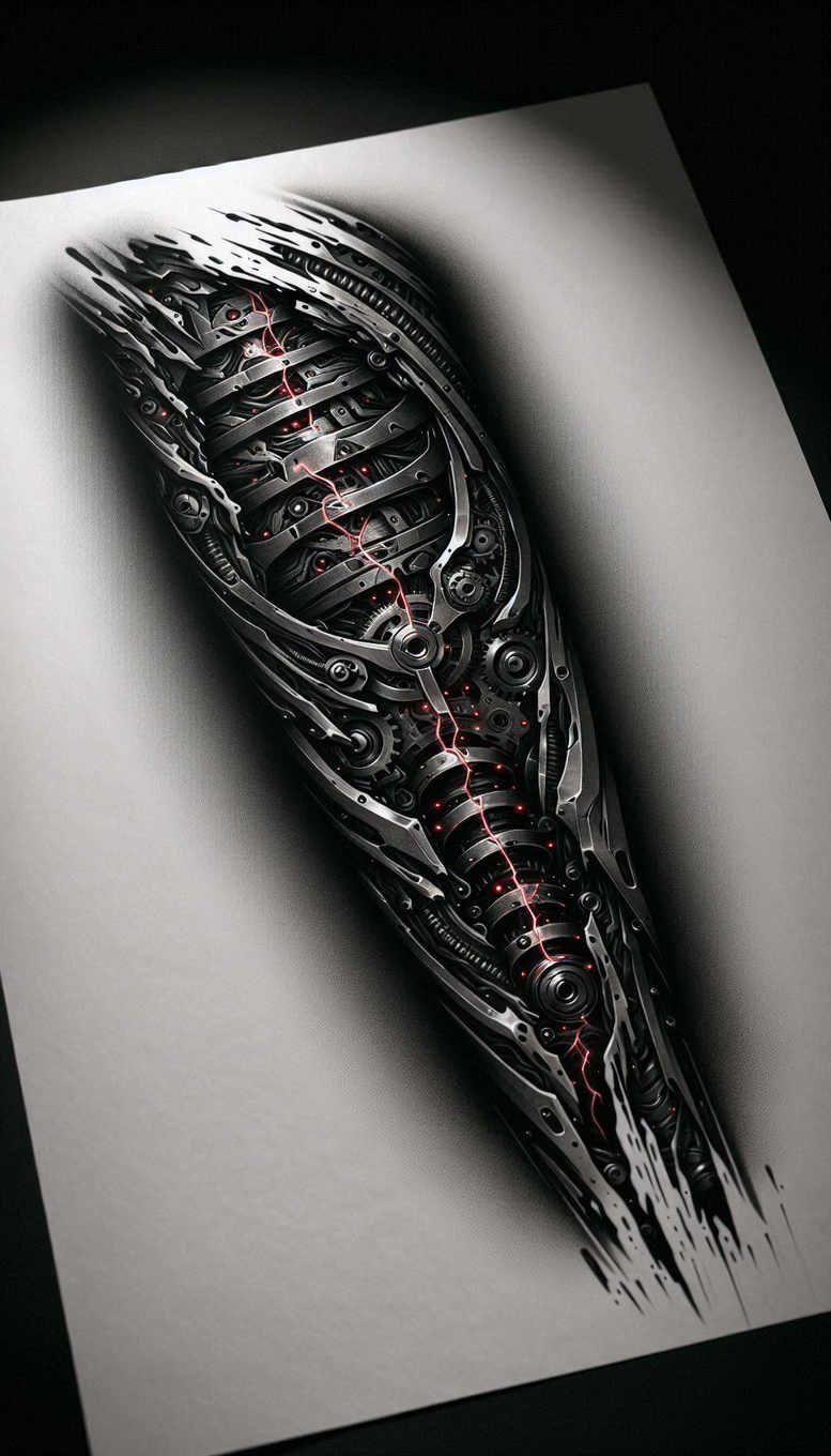This concept features a dramatic biomechanical blade composed of interlocking plates, gears, and screws, rendered in black and grey with subtle red circuit-like veins tracing along the spine. The dagger-shaped motif runs diagonally, its jagged edges and exposed machinery creating a sense of motion and precision. Fine line tattoo shading and crisp detailing build depth across the layered components, while the red accents act as a focal point within the monochrome palette. The piece reads as a versatile tattoo design suitable for forearm or chest placement, with a bold graphic rhythm that translates well into a cover-up concept where existing ink can be masked beneath the metallic surface. This is an AI-generated tattoo project, illustrating how digital artistry can be adapted into wearable body art. Symbolically, the blade suggests cutting away the past and forging a new path, while the intricate mechanics convey resilience and the fusion of human and machine—a theme popular in modern cybernetic tattoos. For tattoo enthusiasts seeking meaningful tattoos, the design combines realism-inspired detail with graphic patterning, offering a striking statement piece that remains legible at smaller scales through careful contrast and negative space. Technique-wise, the work relies on black and grey shading to mimic brushed steel, sharp line work to define geometry, and subtle textures to imply machined surfaces. The overall composition emphasizes flow with the body and adapts easily to larger sleeves or standalone panels. Its cover-up suitability is reinforced by dense darkness and the ability to layer over existing ink, while the mechanical motif provides a distinctive pattern that designers and clients alike can appreciate within a planned tattoo design.