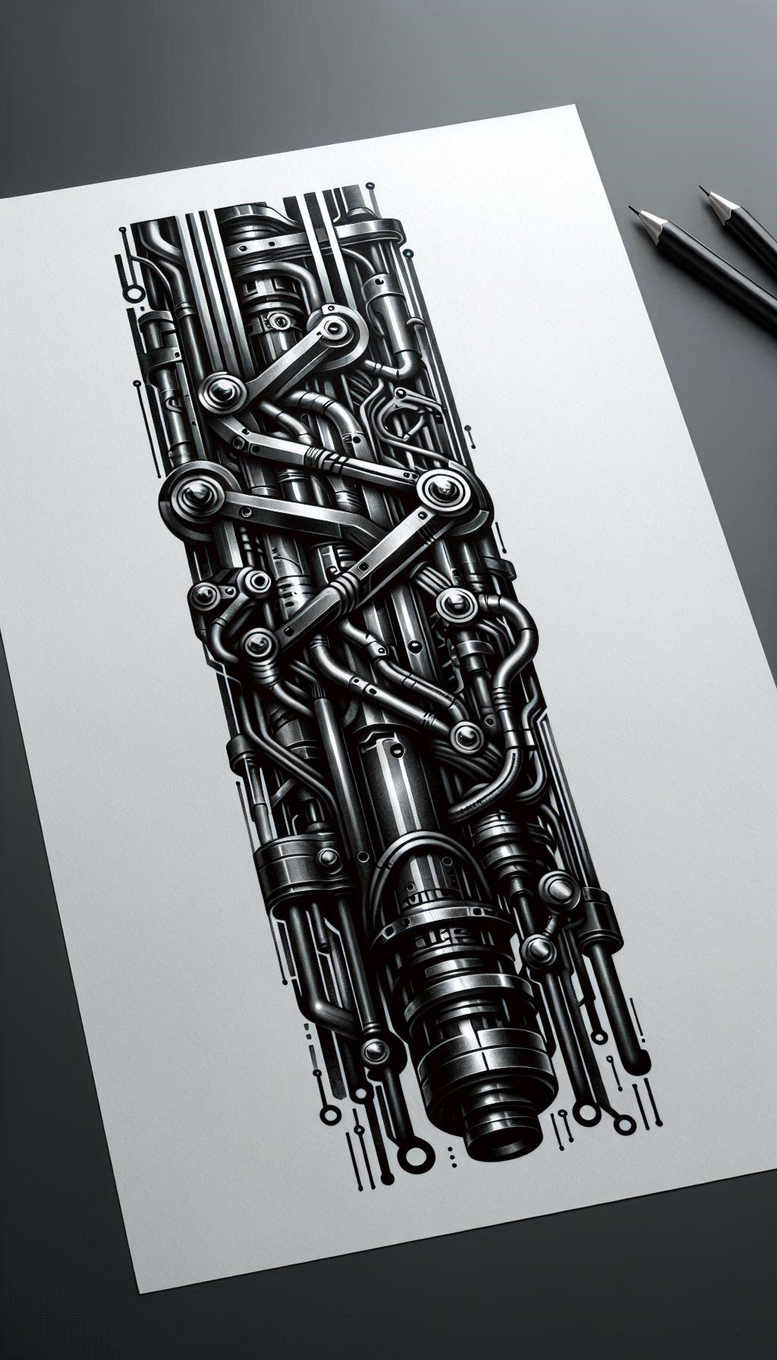 This is an AI-generated tattoo project, presenting a densely engineered cascade of mechanical components rendered in black and grey, arranged as a vertical column that suggests the inner workings of a machine rather than organic imagery. Gears of varying sizes lock with toothed belts, pistons glide beside pipes, valves and cogs interlock with tubes and bolts, all connected by lines and shading that create a sense of depth and motion. The technique prioritizes fine line precision and smooth gradient shading to mimic polished metal surfaces, with crisp edge work that reads clearly at tattoo scale. The composition invites the viewer to follow the paths of conduits and linkages, evoking themes of precision, resilience, and industrial artistry. In practice, this design could function as a standalone back or forearm piece, or as the core of a sleeve, depending on placement. The piece embraces a black and grey palette to emphasize form through light and shadow rather than color, while offering the wearer a stark, modern aesthetic. If translated into skin, the dense black shading has the potential to obscure underlying marks, making it an excellent candidate for a cover-up project. The graphic pattern of loops, rods, and valves lends itself to a pattern-focused approach in tattoo design, appealing to collectors seeking a mechanical motif. This AI-generated tattoo project explores a hyper-detailed, high-contrast motif that sits at the crossroads of realism and industrial design; it aligns with categories such as fine line tattoo and black and grey tattoo, while also resonating with fans of realistic, technical body art. For meaning, the piece can symbolize precision, industry, and the synergy between human craft and machinery, making it a meaningful tattoo design for someone who values craft, structure, and longevity.