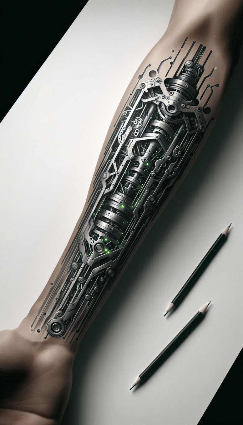This biomechanical forearm tattoo design presents a sophisticated machine anatomy rendered in black and grey. The central column features layered pistons and cylinders encased by interlocking gears, brackets, and rails that follow the forearm’s natural curve. Crisp linework and smooth shading create depth, while subtle highlights emphasize metallic surfaces and pin joints. The composition reads as a single machinery ecosystem, with panels and wires weaving through the mechanical skeleton and punctuated by small green LED-like accents suggesting powered circuitry. The piece blends industrial design with tattoo artistry, delivering a highly detailed pattern that can be read as an engineering map or a symbolic reservoir of strength. From a technical standpoint, the high-contrast contrast between dense inner mechanisms and the outer skin tone achieves a realistic illusion of subdermal machinery, a hallmark of biomechanical tattoo design. The dark, shadow-heavy aesthetic makes a bold statement on the forearm, and the dense structure provides a natural canvas for a cover-up if the wearer wishes to conceal an older tattoo. This AI-generated tattoo project demonstrates how machine motifs translate into skin ink, balancing precise linework, negative space, and tonal shading to preserve legibility over time. The described motifs—armature, pistons, gears, cylinders, rods, circuits—define a cohesive biomechanical narrative and offer a versatile blueprint for future variations in black and grey tattoo design. In practical terms, the design can be adapted for other limbs or larger canvases while retaining its mechanical rhythm and dramatic silhouette, ensuring it remains relevant within contemporary tattoo trends and body art lexicon.