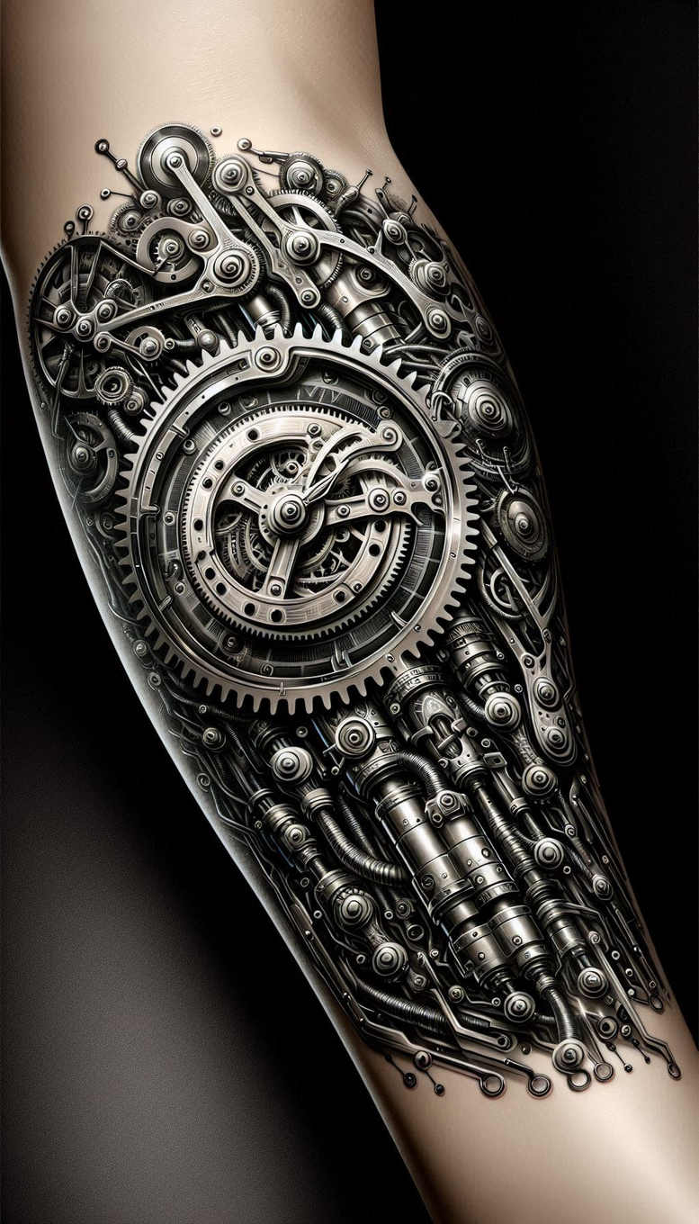 AI-generated tattoo project presented as a masterful study in mechanical realism, executed in black and grey. The main motif is a sprawling clockwork sleeve concept built from gears, cogs, pistons, tubes, and wires, rendered with meticulous line work and high-contrast shading to simulate metal. A dominant circular gear sits at the center, its teeth interlocking with surrounding rotors and shafts; smaller gears radiate outward, linked by rod-like accents and delicate rivets. The composition folds into the forearm with a sense of depth, as if the mechanism is partially embedded under the skin. The artist uses fine line techniques to capture chrome-like highlights and brushed steel textures, while gradients create the impression of polished surfaces and recessed crevices. The piece uses dense black ink on a pale skin tone, producing a dramatic, almost sculptural effect, and the dark background reinforces legibility and impact. Subject matter leans into industrial and steampunk sensibilities rather than literal engineering, inviting interpretations of time, precision, and human-machine fusion. The design functions well as a cover-up option due to its heavy noir shading and large negative space, enabling existing tattoos to be masked beneath a convincing machinery motif. As a tattoo design, it embodies meaningful tattoos that celebrate craft and ingenuity, with potential for customization into a full sleeve or larger panel. AI-origin note: this is an AI-generated tattoo project, demonstrating how algorithmic design can translate to skin art with careful gear textures, interlocking patterns, and realistic metalwork. For discovery and SEO, terms such as tattoo, tattoo design, meaningful tattoos, fine line tattoo, black and grey, realistic tattoo, and ink are relevant, while the underlying machinery provides a robust foundation for productized patterns and future Japanese-style or tribal-inspired variations.
