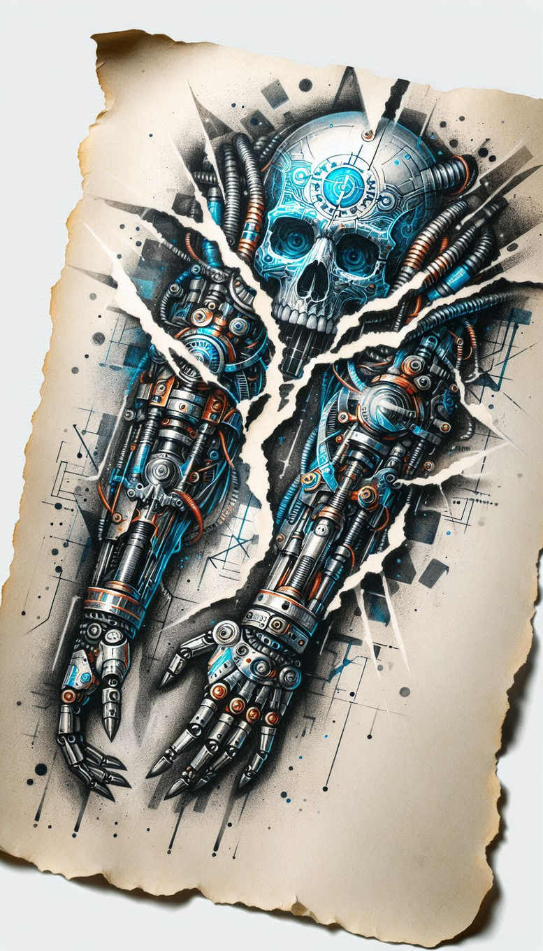 AI-generated tattoo project presenting a cybernetic skull with twin mechanical arms, rendered in electric blue and steel grey with copper-orange accents. The composition reads as if the skeleton breaks through weathered parchment, jagged cut lines revealing inner circuitry and geometric fragments. The skull features clean white teeth, cobalt sockets, and a subtle crest of machine plating that echoes aurora-like glow. The arms are built from layered hydraulics, pistons, gears, and conduits, with fine line highlights and broad shading to convey depth. The overall style is a hybrid of realistic tattoo technique and graphic techno-ornament, suitable for a bold chest, back, sleeve, or calf. High-contrast blacks anchor the piece while the blue tones bring life, and the orange nodes serve as focus points along the joints. The design uses a combination of smooth gradients and sharp line work, delivering a look that translates well to skin and ink. Symbolically, the cyborg skeleton suggests resilience, transformation, and the fusion of human vitality with machine precision—an appealing motif for meaningful tattoos and lovers of cyberpunk, robotics, and industrial aesthetics. The artwork aligns with current trends in tattoo design that embrace black and grey or full-color palettes, and can be adapted to a range of skin tones. If desired, this concept can be refined into a custom tattoo design with proportional adjustments for placement and size. As an AI-generated tattoo project, it demonstrates how artificial intelligence can propose intricate, pattern-rich compositions that still honor traditional tattoo fundamentals like line quality, shading, and composition. The finished piece promises a striking, long-lasting body art statement for those seeking a powerful fusion of biomechanical imagery with classic skull iconography, capturing both technological awe and personal meaning.