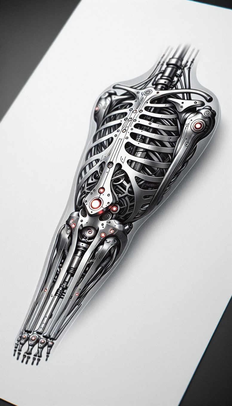 Presenting a mechanical arm tattoo design that reads as a biomechanical forearm, rendered in black and grey to emphasize depth, texture, and realism. The piece unfolds along the length of the arm as an intricate cross-section of engineered anatomy, with rib-like metal plates curving over a central spine that exposes interlocking gears, pistons, cables, and screws. Crisp line work defines each component, while graduated shading creates a convincing three-dimensional form, as if the skin were a pane of glass revealing the machine beneath. Polished chrome highlights contrast with matte graphite shadows, and restrained red accents at select joints suggest actuation and motion. The composition balances symmetry with mechanical logic, ensuring a fluid flow that follows the forearm’s curvature and makes it suitable for a large-scale tattoo, whether as a standalone piece or the centerpiece of a sleeve. This is an AI-generated tattoo project, offering a concept ready for adaptation to individual anatomy, scale, and placement in a custom tattoo design workflow. Symbolically, the design pairs human resilience with technological precision, inviting interpretations tied to meaningful tattoos and body art. For practitioners, the image provides clear cues for line weight, texture, and shading techniques that translate well into black and grey realism or ink with color accents. The pattern-like arrangement of gears, plates, and cables also invites potential extensions, such as circuit tracings or biomechanical motifs, to create a cohesive forearm composition that resonates with modern ink enthusiasts and stands the test of time as a powerful tattoo design.