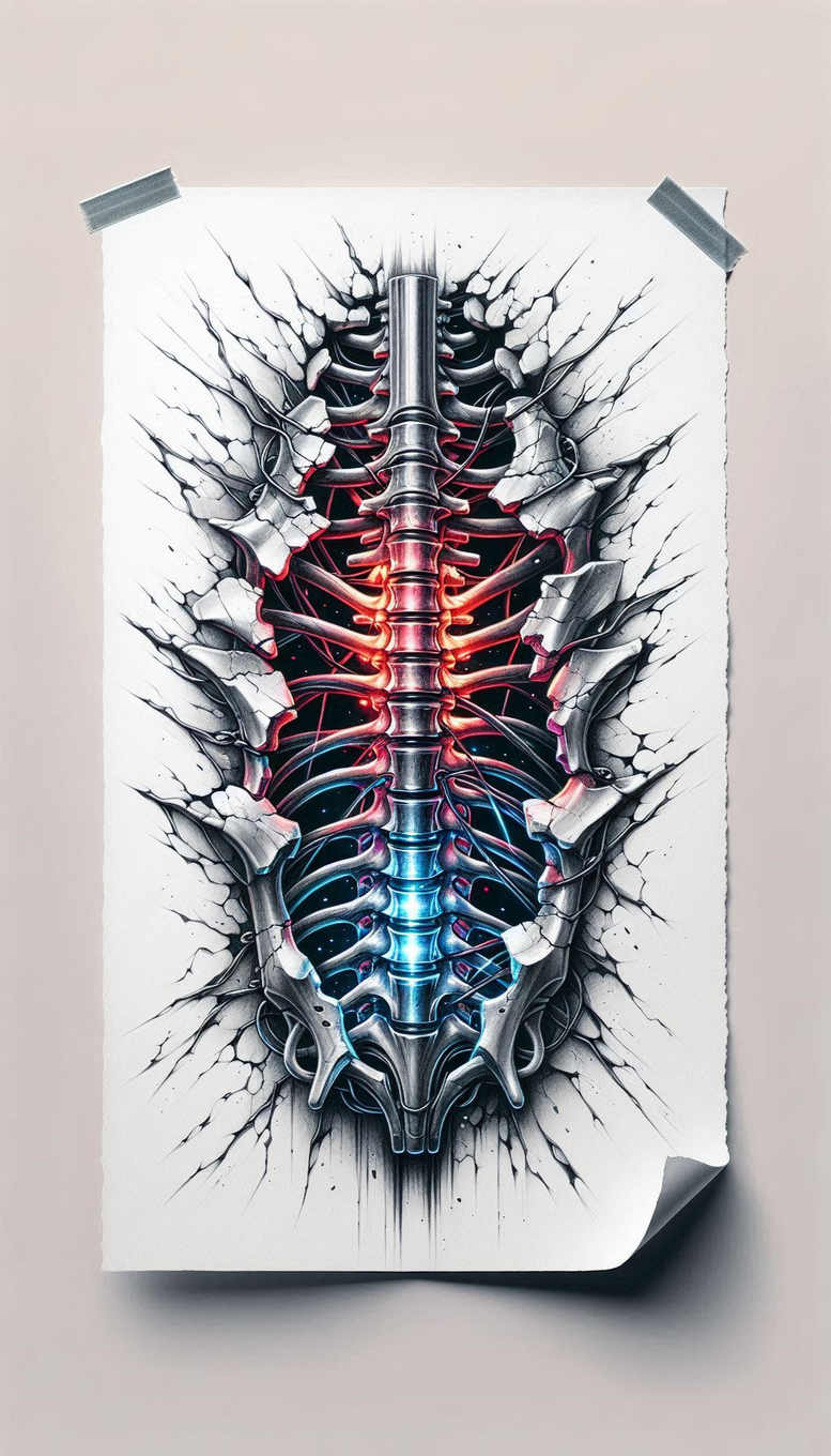 This piece presents a bold, AI-generated tattoo project concept featuring a biomechanical spine surrounded by a shattered backdrop. The central column is rendered as metallic vertebrae with precise shading to deliver three-dimensional realism. A color gradient runs from cool cobalt at the base to incandescent red and orange toward the midsection, while fine lines and crisp edges create a high-contrast look that reads on large canvases. Interlaced with the spine are stylized ribs and neural-like vessels that trace along the bones, forming a circuit-board aesthetic that blends science with art. The surrounding cracked field mimics torn skin or plaster, emphasizing the spine breaking through a surface and giving the design a dynamic energy. Negative space at the edges keeps the focus on the core anatomy and neon glow, making it suitable for bold body art and as a cover-up concept if desired. As an AI-generated tattoo project, it demonstrates how digital illustration can inform real-world tattoo design, offering a precise reference for needlework, shading, and color transitions that a tattooist can adapt to different placements, skin tones, and sizes. The piece balances mechanical geometry with organic curves, inviting meanings of resilience, energy flow, and transformation—qualities that resonate with meaningful tattoos and with the appeal of modern ink. For those exploring tattoo styles, this concept nods toward fine line and Japanese-inspired biomechanical motifs, while remaining adaptable to black and grey or full-color versions. It also serves as a strong foundation for additional motifs like infinity and floral elements—rose or lotus flower tattoos—that complement the central spine without competing with it, making it a versatile option for a custom tattoo design that can evolve with the wearer and suit tribal tattoo aesthetics or other personal symbolism.