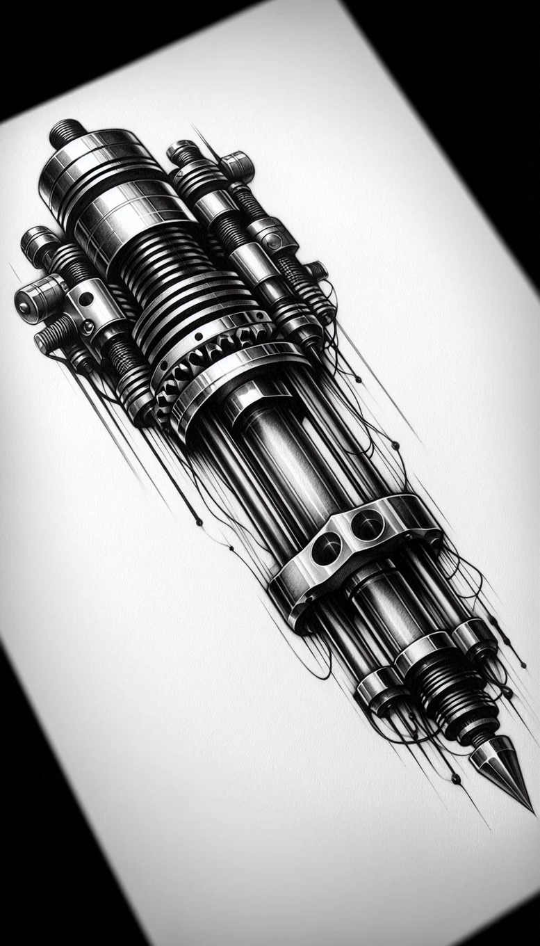 An industrial gear core tattoo design rendered in precise black and grey tones, the composition centers on a tapered cylinder built from interlocking rings, pistons, and gear teeth. The artist’s knife-sharp line work and dense shading create a high-contrast illusion of three-dimensional depth, while fine line accents and minuscule connectors hint at the inevitability of motion and power. The outer frame is wired with delicate cables that trail outward, giving a sense of complexity and tension, and a robust shaft pierces through the center, anchoring the machinery to the skin as a metaphor for resilience and transformation. The motif draws on machinery symbolism—engineer’s craft, durability, and the idea of turning pressure into propulsion—making it a meaningful tattoo for someone who values ingenuity and persistence. The piece has a disciplined geometric rhythm: concentric cylinders, symmetrical gaps, and repeating bolts convey order within chaos, an aesthetic that sits comfortably on larger canvases like the back or forearm, while still reading crisply at close range. The black and grey palette enables a wide tonal range, from near-ebony shadows to pearl highlights, ensuring strong contrast on lighter skin and nuanced shading on darker tones; this also facilitates aging with clear line integrity over time. For those seeking a cover-up, the heavy density and opaque blacks offer excellent camouflage for previous tattoos or marks, and the design can be scaled or simplified to fit individual contours. Although AI-generated, this tattoo project demonstrates how algorithmic design can translate technical dreams into professional-grade ink concepts, ready for collaboration with a tattoo artist who can tailor line weight, spacing, and component detail to personal anatomy, lifestyle, and narrative intent. In terms of SEO and audience appeal, the piece aligns with popular tattoo design themes: black and grey realism, mechanical motifs, and contemporary body art fused with traditional craft; it nods to genres such as realistic tattoo and Japanese-influenced hardware aesthetics while remaining versatile for modern wearers seeking statement tattoos with meaning.