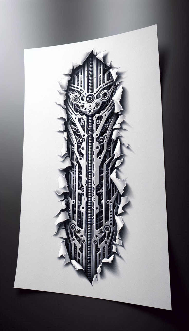 AI-generated tattoo project. The design presents a dark mechanical spine of interlocking plates, gears, and pistons that seems to tear through white skin to reveal a cybernetic core. Rendered in black and grey with precise shading, the piece emphasizes depth, metallic texture, and the cool sheen of chrome. The central column flows from the top to the bottom of the composition, built from layered plates and linked rods that suggest a biomechanical anatomy. Surrounding elements form a lattice of gears, channels, screws, and rivets, creating a graphic pattern that reads as both technology and art. The torn-paper frame reinforces the illusion of intrusion, making this concept highly suitable as a cover-up tattoo: heavy shadows and dense line work can mask preexisting marks while delivering a bold focal point. The work adheres to a realistic, technical aesthetic, yet preserves a graceful sleeve rhythm so it can wrap a forearm or be extended into a full sleeve. The black and grey palette provides timeless contrast, while negative space ensures clarity on the skin and future readability as the wearer ages. For seekers of meaningful tattoos, the machinery motif symbolizes resilience, precision, and transformation—a nod to human-technology synergy. The piece invites careful shading to render metallic textures, highlights on curved surfaces, and subtle gradations that keep the design legible from a distance. Its graphic, pattern-driven composition makes it a strong choice for tattoo design enthusiasts who crave a futuristic yet timeless statement. This AI-generated tattoo project demonstrates how mechanical imagery can become a powerful form of body art, offering a perfect cover-up opportunity for darker skin tones or old ink.