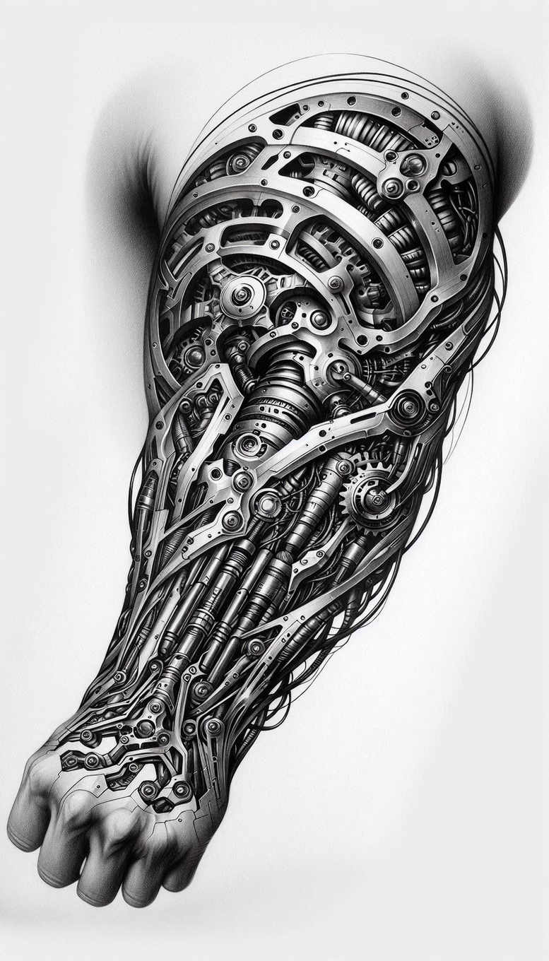 This is an AI-generated tattoo project presenting a hyper-detailed mechanical arm rendered in black and grey realism. The design traces the forearm and elbow with interlocking metallic plates, tubular tendons, and an array of gears, cogs, bolts, and conduits that resemble a living machine. Each element is carefully layered to convey depth and motion, from the polished chrome-like surfaces to the darker recesses between components. The piece relies on fine line work and smooth gradients to achieve a believable volume, while the stark contrast between light and shadow highlights the mechanical anatomy and the implied function of the limb. Symbolically, the arm as a man-made extension speaks to themes of strength, resilience, and integration with technology, making it a meaningful tattoo design about human-machine evolution. The use of negative space around the outer edge helps the components breathe on the skin and keeps the composition readable as a large tattoo design. Because the image is very dark, it is particularly well-suited for a cover-up, allowing new ink to flow over existing marks with minimal loss of detail. This project demonstrates how black and grey shading can render complex machinery with a sense of weight and texture, offering options for a full-sleeve continuation or a standalone forearm piece. In the broader context of tattoo artistry, the design sits at the crossroads of realism and biomechanical aesthetics, inviting clients to consider custom tattoo design that balances technical precision with expressive intent. For enthusiasts of pattern-heavy tattoo design, the recurring motifs of gears and tubing create a cohesive motif that can be extended into additional panels or integrated with other black and grey elements. It also serves as an example of how AI-generated concepts can translate into professional tattoo projects, delivering a high-clarity blueprint for evidence-based inking, while preserving the artisanal sensibility of traditional body art.