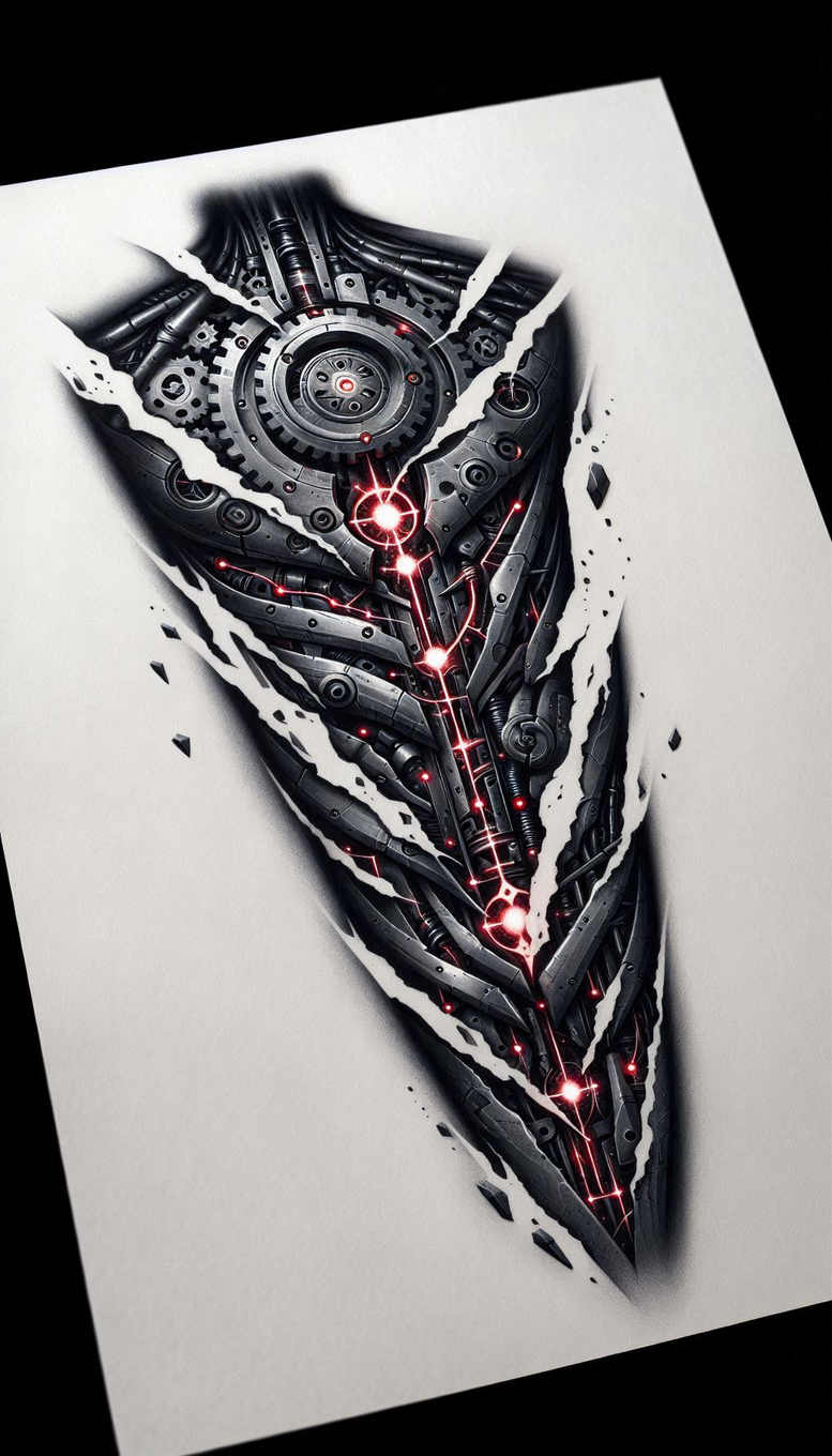 An AI-generated tattoo project featuring a hyper-detailed mechanical heart motif assembled from interlocking gears, plates, and cables. The composition centers on a circular rotor near the top, with crimson linear highlights tracing a spine-like path through layered metal strata. Torn edges of the white negative space frame a high-contrast black and grey study that reads as both machine and flesh, a bold tattoo design with strong cover-up potential. Patterned circuitry and riveted panels create a dense, graphic texture that can effectively conceal existing ink beneath its dense network of lines. The red nodes and luminous veins suggest energy flow, while meticulous shading and smooth gradient transitions give the piece a lifelike metallic sheen, reinforcing a realistic tattoo aesthetic. The piece emphasizes fine line tattoo techniques along the edges and along the circuit paths, producing crisp details suitable for small-to-medium placements, and it adapts well to Japanese style tattoo sensibilities through precise linework and restrained palette. In terms of symbolism, the motif can signify resilience, the fusion of human and machine, and personal metamorphosis; the gears evoke timing and endurance, while the heart implies vitality and emotion. This art direction aligns with the broader realm of tattoo design, from traditional rose tattoo design cues to modern cybernetic interpretations, and the black and grey palette keeps it compatible with classic ink workflows. Since the image is very dark with luminous red accents, it is especially well-suited as a cover-up, enabling skilled artists to mask prior tattoos with density and depth. Note that this is an AI-generated tattoo project, created to explore contemporary body art concepts while remaining adaptable to various sizes and placements; it can be enjoyed as meaningful tattoos, or reinterpreted as a custom tattoo design for clients seeking a striking biomechanical motif.