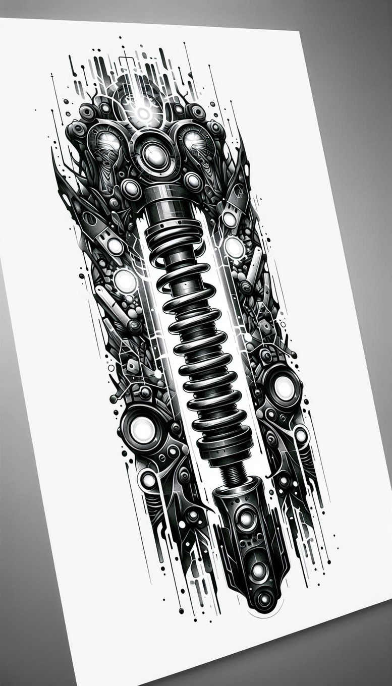AI-generated tattoo project concept of a mechanical industrial motif designed for a bold statement sleeve. The design centers on a vertical shock absorber formed by a prominent coil spring, tucked between two structural housings, and surrounded by gears, bolts, plates, and splines rendered in black and grey. The composition uses dense linework with high-contrast shading to reproduce the gleam of metal and the texture of machined surfaces. The central spring functions as a spine, evoking resilience and motion, while the interlocking gears and circular pistons radiate outward to convey mechanical interdependence and perpetual drive. Plate-like panels and threaded bolts anchor the image, offering strong negative spaces that aid legibility on skin and facilitating potential blending with existing tattoos. The vertical orientation makes it an excellent centerpiece for forearms, arms or calves and invites expansion into a full sleeve or back piece. In terms of symbolism, the design can be read as a tribute to engineering precision, human labor, and the relentless cycles of progress; the monochrome palette emphasizes form and shadow, aligning with black and grey tattoo aesthetics, realism, and fine line precision. For practitioners, this is a customizable tattoo design that can adapt to different limb shapes and skin tones. The image embraces the vocabulary of industrial art while retaining graphic clarity for long-term readability, a feature essential for meaningful tattoos and body art. This is an AI-generated tattoo project concept and a strong candidate for a cover-up when older ink is present, thanks to its dense shading and solid silhouettes. Keywords woven through include tattoo, tattoo design, meaningful tattoos, fine line tattoo, black and grey, realistic tattoo, pattern, coil-inspired imagery; it also aligns with themes of custom tattoo design, Japanese style tattoo influences, and complementary gear motifs to build a cohesive sleeve.