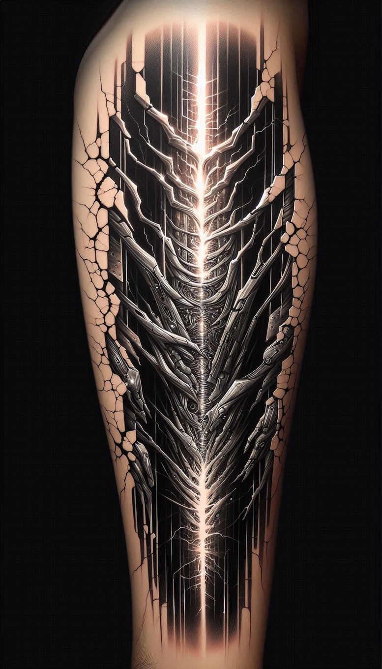 AI-generated tattoo project rendered in black and grey realism, this piece centers a luminous vertical spine composed of interlocking metallic branches that run the length of the calf. The central axis is flanked by jagged plates and rib-like shards, while the outer edges fracture into a repeating crack pattern that creates dramatic negative space. The shading relies on smooth gradients and crisp white highlights to simulate a neon glow along the spine, with fine line work defining the branching elements and the surface textures of the plates. Although primarily mechanical in vibe, the composition reads as a biomaterial fusion of flesh and machine, suggesting resilience, transformation, and the power of structure. The design works well as a cover-up on a dark canvas—its high-contrast center and surrounding negative space can obscure an older tattoo while preserving leg readability from knee to ankle. The motif’s rhythm, built from spine-branch-plate repeats, offers strong graphic patterning that can be extended along the leg or integrated with subtle floral or geometric accents if desired. From a technical standpoint, the piece uses black ink with layered shading to create depth, while white highlights heighten the illusion of depth and energy along the central line. For tattoo lovers, this is a black and grey realism piece that remains clear and readable over time, a meaningful tattoo design about endurance and transformation suitable for small tattoos or larger leg pieces. The join between the central glow and the surrounding mechanical forms invites interpretation, while the overall balance of negative space and solid silhouettes ensures longevity. As an AI-generated project, it demonstrates how algorithmic design can yield intricate, market-ready tattoo concepts that honor traditional tattoo values—bold contrast, precise line work, and a timeless black and grey palette, with subtle echoes of Japanese shading to enhance dimensionality.