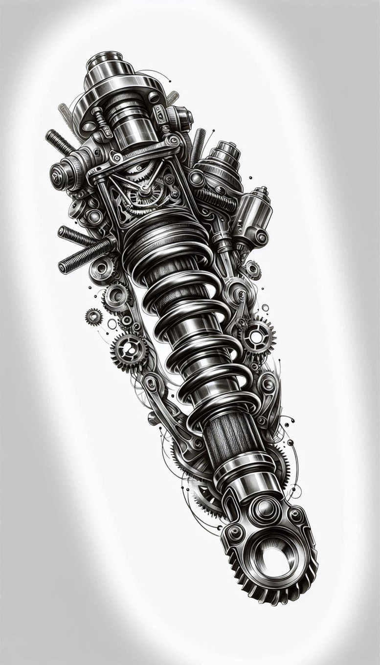 AI-generated tattoo project exploring a steampunk-mechanical motif, this design centers on a cylindrical shaft entwined with gears, springs, bolts and cog wheels. Rendered in black and grey with bold linework and subtle cross-hatching, the piece relies on high-contrast shading to create the illusion of polished metal, bevelled edges and mechanical depth. The central column tapers toward the bottom, wrapped by a dramatic coil spring that spirals around it while interlacing arms and gear clusters emerge from the sides. Around the core, gears mesh with rods, pins and small circular rims, generating a rhythm that reads like a pattern when viewed from a distance yet rewards closer inspection with intricate micro-details. The composition is designed for flexing anatomy, suitable for a forearm or calf sleeve, and the arrangement of circular elements creates movement as if machinery were in motion. The design uses fine line tattoo technique to achieve delicate contrast and a realistic metallic texture, while the black ink provides density for a strong silhouette that remains legible as the skin ages. Symbolically, the assembly can represent resilience, precision, and the idea that life is constructed from interconnected parts; it can be interpreted as a celebration of engineering, craftsmanship, and the fusion of art with industry. As an AI-generated tattoo project, it demonstrates how algorithmic creativity can yield tattoo-ready artwork with crisp linework, intricate motifs and a striking visual impact. Because of its dense dark shading and complex focal point, it is especially well-suited for cover-up applications, offering versatile masking while preserving a dynamic graphic presence. In terms of style and keywords, the design aligns with black and grey tattoo traditions, featuring a pattern-rich mechanical theme that complements tattoo design portfolios and meaningful tattoos for collectors of small to medium-scale pieces.