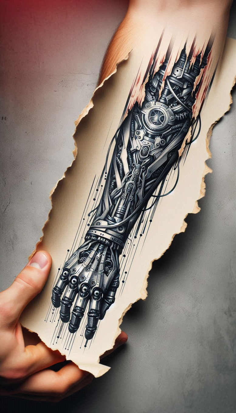 AI-generated tattoo project presents a cybernetic forearm rendered in high-contrast black and grey realism. The composition uses a torn-paper reveal, exposing an intricate inner mechanism of gears, pistons, tubes, and cables that cascade along the forearm. The design blends meticulous linework with biomechanical shading to create depth and motion, as if the machinery is bursting through the skin. The forearm is built from a mosaic of interlocking components, including circular gear hubs, segmented plates, and flexible cables threading through the composition, punctuated by sharp scratch lines that suggest energy and tension. The piece uses negative space and elongated vertical elements to give the illusion of shredded paper and a dynamic dramatic effect while the hardware remains crisp and precise, bordering on a cyberpunk aesthetic. The overall styling leans toward realism in finish, with careful gradation of black and grey to produce metallic sheen, micro-scratches, and micro-dots that mimic rivets and wear. The design works as a bold tattoo design for someone seeking a standout mechanical sleeve, and can be adapted for smaller tattoos or full forearm sleeves. The concept invites interpretation as a symbol of human-machine integration, resilience, and precision—each hub signifying focus, each cable representing connectivity. For meaningful tattoos, this piece embodies the ideals of power, dexterity, and innovation through ink. The technical cues—high-detail line density, layered shading, and strategic use of negative space—offer clear guidance for tattoo artists pursuing a realistic black and grey approach with fine line tattoo accents. In addition, the torn-paper motif adds a conceptually dramatic edge, and the mechanical motif aligns with Japanese style tattoo influences while staying firmly a modern, graphic body art proposal. If you are considering a cover-up, the dense blackwork and multi-layer shading can help conceal prior work beneath while preserving the mechanical detail; as an AI-generated tattoo project, it showcases how illusions of depth and circuitry can translate into a convincing forearm sleeve and stand up to the test of time in ink.